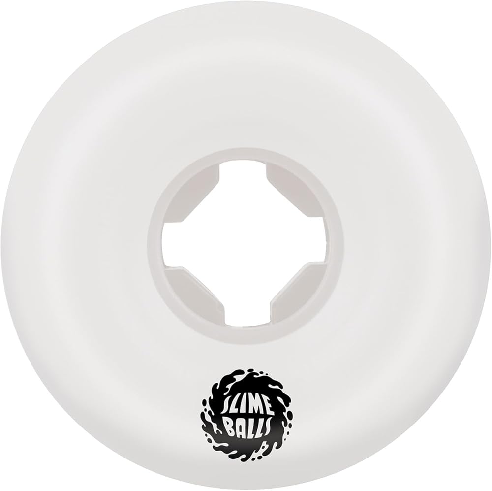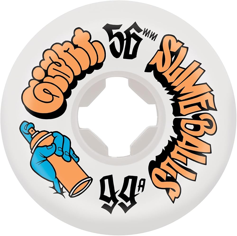 Slimeballs 56mm Speed Balls white wheels featuring graffiti art by Mike Giant with spray can wrap packaging and included decal. Speed Balls feature a hard, conical edge shape for firm coping lock, wide riding surface, and high performance 99a urethane.