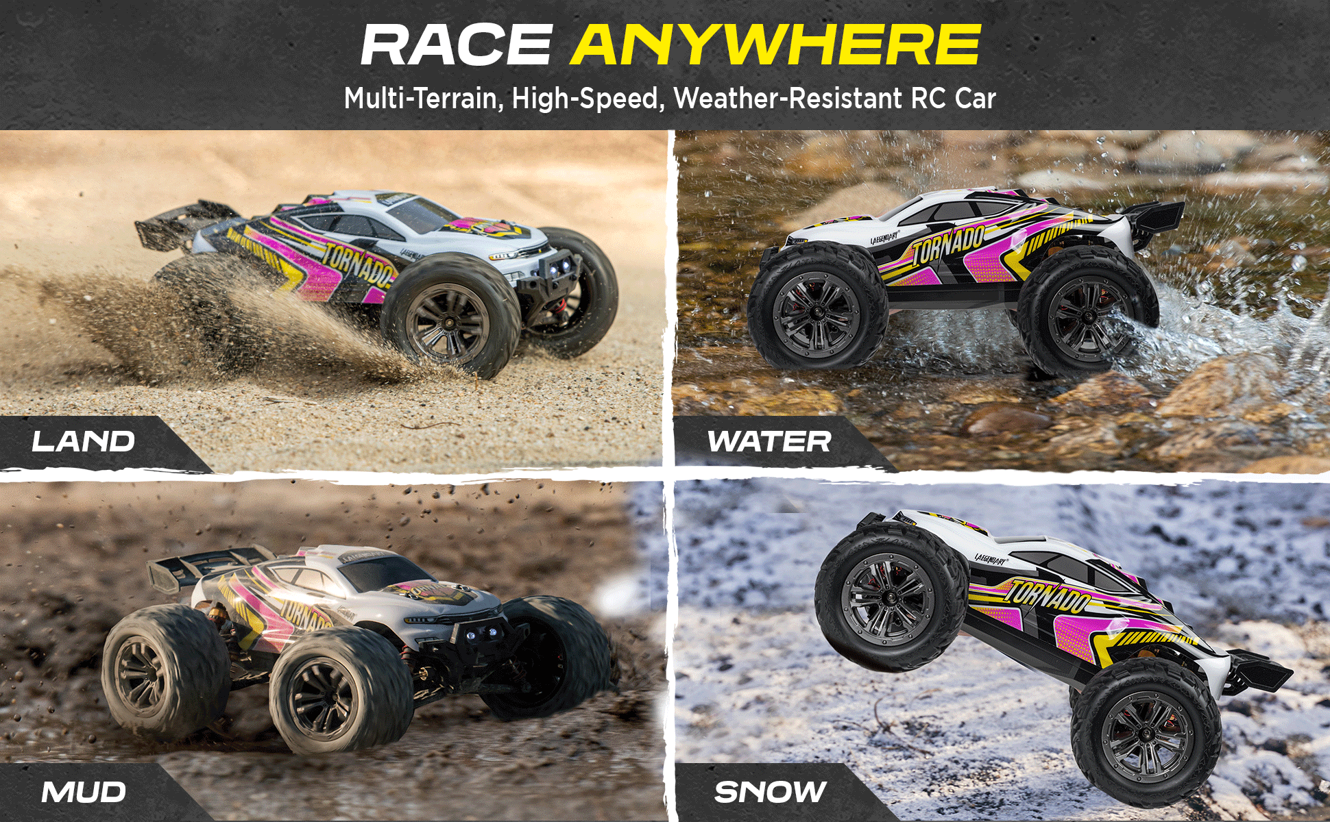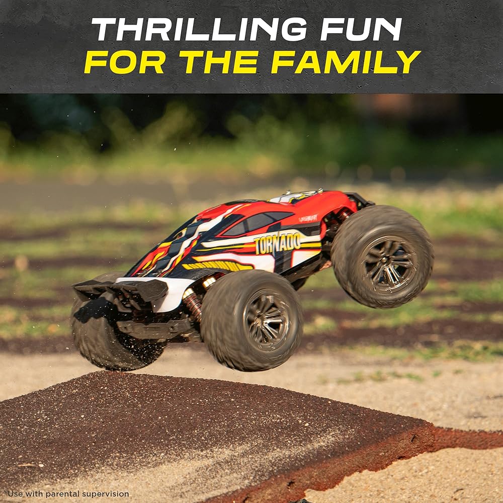القوة والمظهر المذهل: تتميز شاحنات الوحش التي تعمل بالتحكم عن بعد بمقياس 4x4 1:12 بقبضة وتشغيل ومتانة غير عادية. تسمح لك الصدمات المعدنية عالية الأداء والعجلات شديدة التحمل بقيادة سيارة تورنادو آر سي في جميع التضاريس مثل الشاطئ أو الرمال أو الصخور أو الطرق الخرسانية.