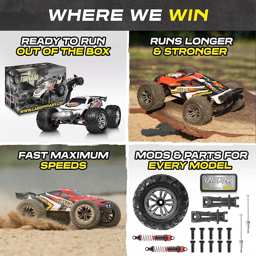 هدية مثالية لعيد الميلاد أو لأي مناسبة: إذا كنت تبحث عن هدية مثيرة ورائعة للغاية، فسوف تحب سياراتنا التي يتم التحكم فيها عن طريق الراديو. يمكنك التسابق بسيارتين أو أكثر من سيارات الطرق الوعرة RC في نفس الوقت، دون أي تدخل. ما عليك سوى إقران الشاحنة الأولى بجهاز التحكم عن بعد الخاص بها وقيادتها، ثم كرر نفس الخطوة للشاحنة الثانية. يعد سباق عائلتك أو أصدقائك أمرًا مثيرًا دائمًا ويمكن للجميع الانضمام إلى متعة Laegendary