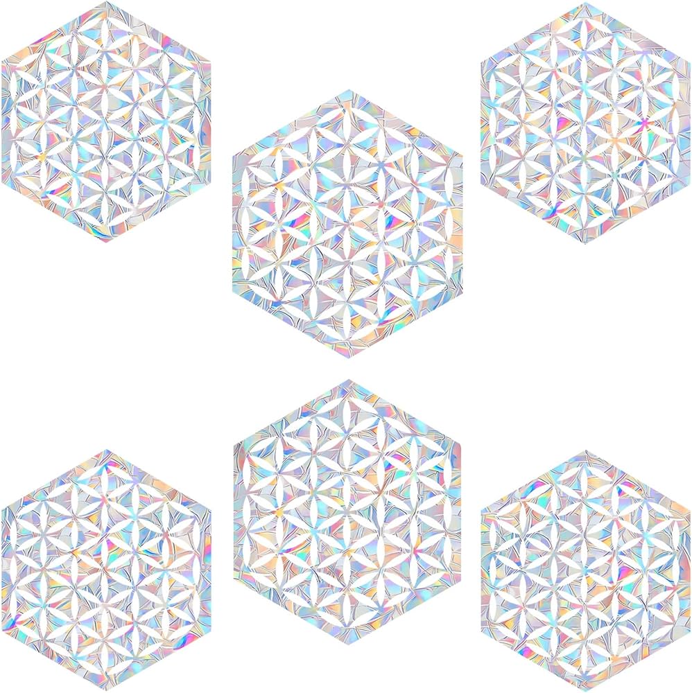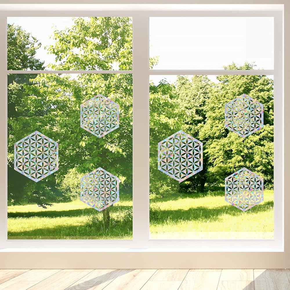 6 قطع من ملصقات النوافذ على شكل زهرة الحياة لضربات الطيور - ملصقات نافذة مضادة للتصادمات لإنقاذ الطيور من اصطدامات النوافذ، ملصقات نافذة منشورية غير لاصقة، ملصقات لالتقاط أشعة الشمس بألوان قوس قزح