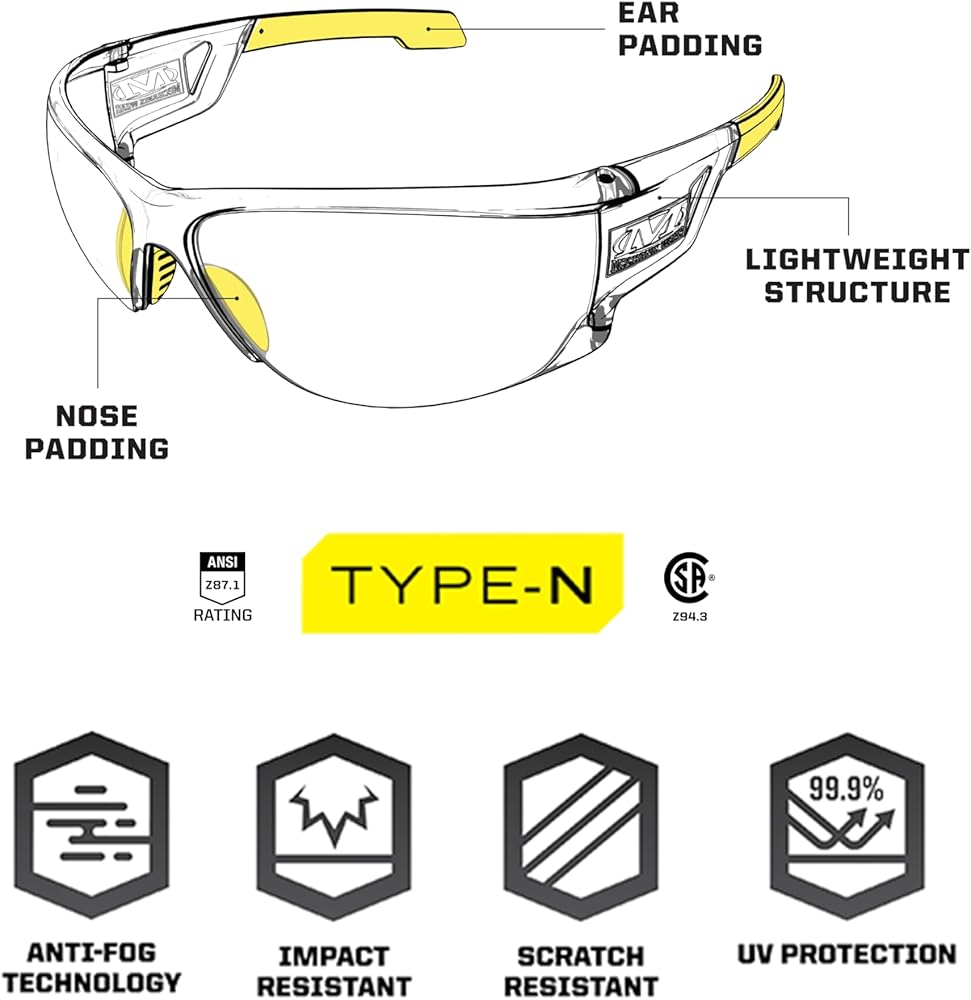 Vision Type-N safety eyewear is built on a lightweight, wraparound frameless impact-resistant polycarbonate structure for maximum field of vision and comprehensive eye protection. Designed for indoor or outdoor use across various industries and incorporating anti-fogging technology, the Type-N checks the box for both protection and style. Built for both men and women, these safety glasses are one size fits all, secure fitting, and ready for long hours on the job. The unique rimless design of our Type-N safety glasses provide a wide field of vision and are great for general purpose, automotive, mechanic, construction, or woodworking jobs. When it's time to play, easily transition to range sports, airsoft, or riding all-terrain vehicles in the elements. These safety glasses are the perfect accessories to pair with our revolutionary Mechanix Wear Gloves and a must-have for your toolbox.
