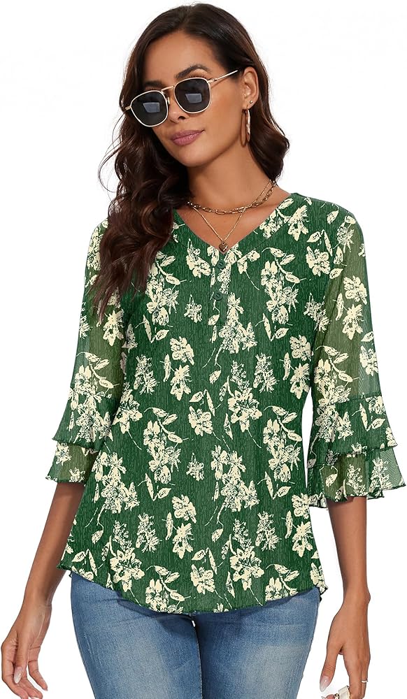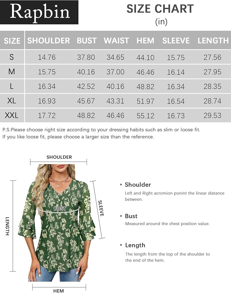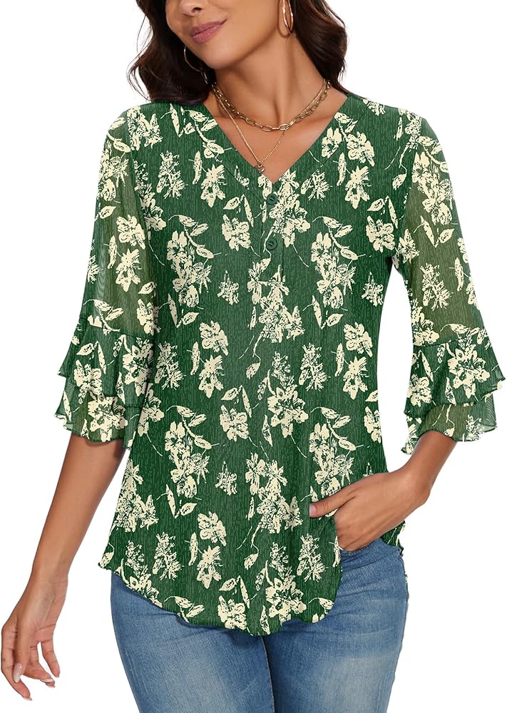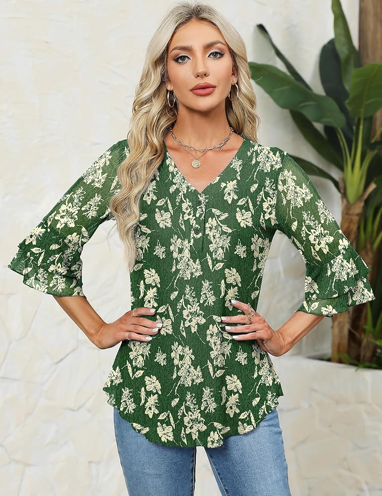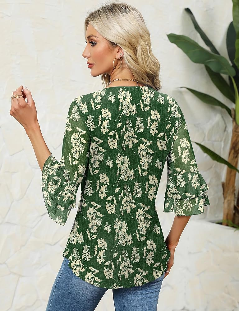 【تصميم فريد】رقبة كلاسيكية بأزرار سفلية على شكل حرف V، أكمام جرس مكشكشة 3/4، حاشية منحنية مزدوجة الطبقات، أنيقة ورومانسية، الشكل المثالي للبلوزات الأنيقة يمكن أن يخفي دهون البطن أو الورك.