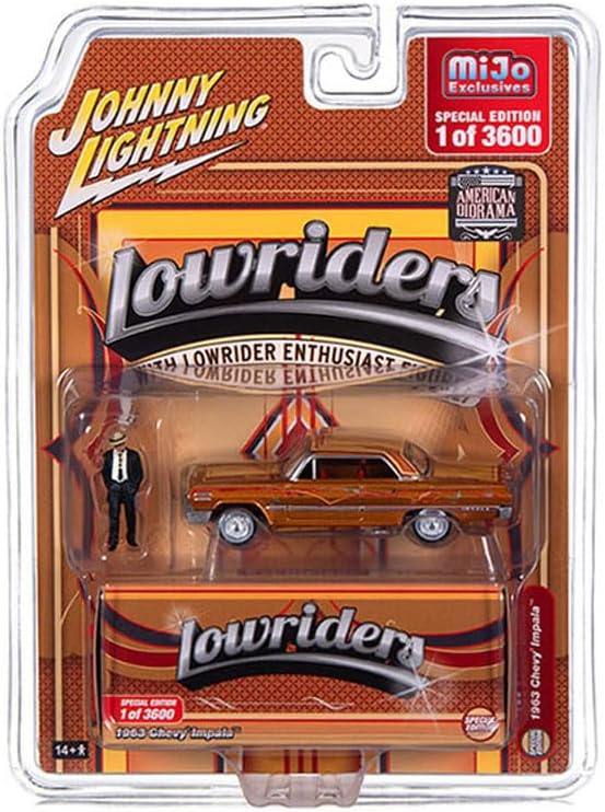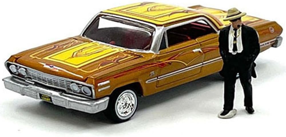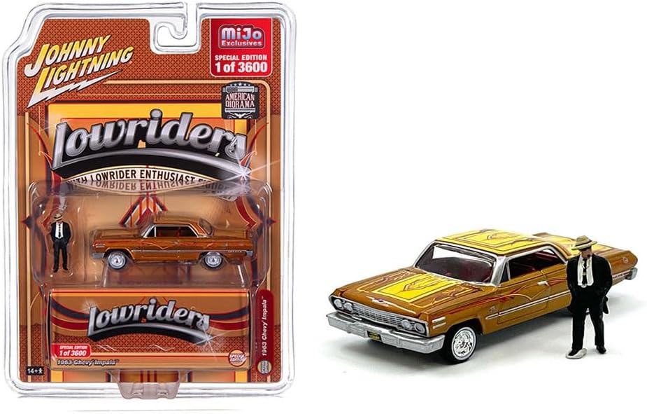Brand new 1/64 scale diecast car model of 1963 Chevy Impala Lowrider Orange with Graphics and Diecast Figure Limited Edition to 3600 pieces Worldwide die cast model car by Johnny Lightning JLCP7459