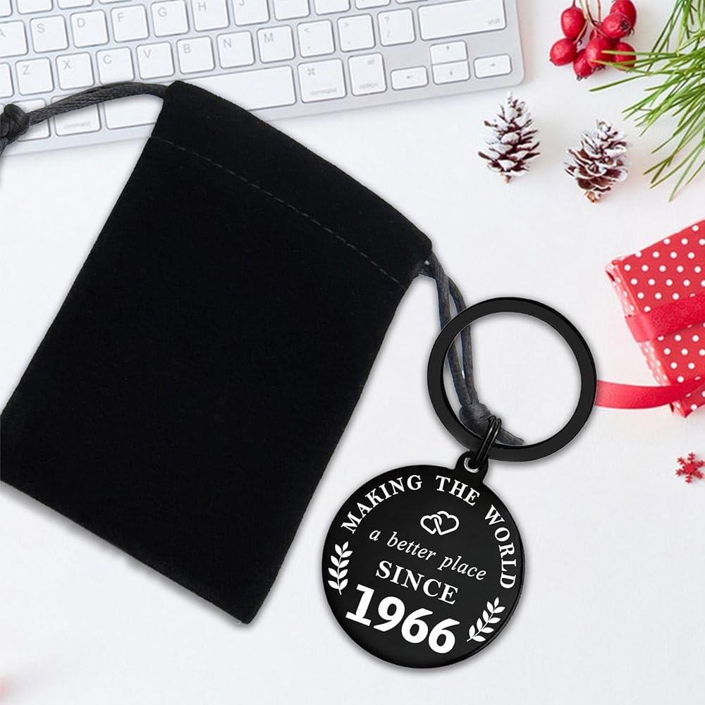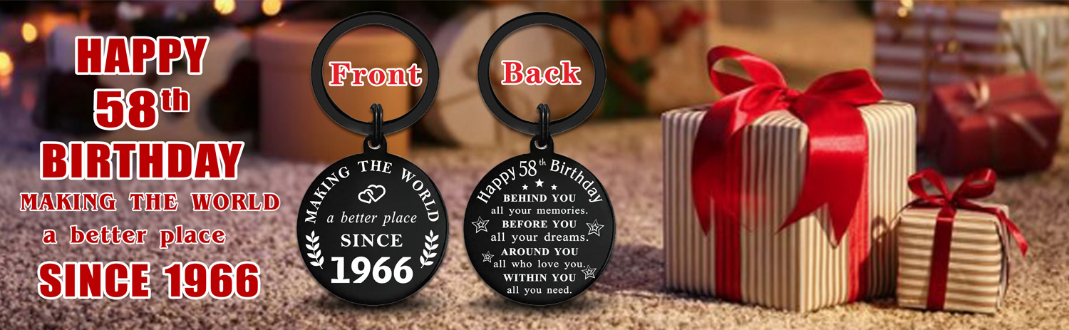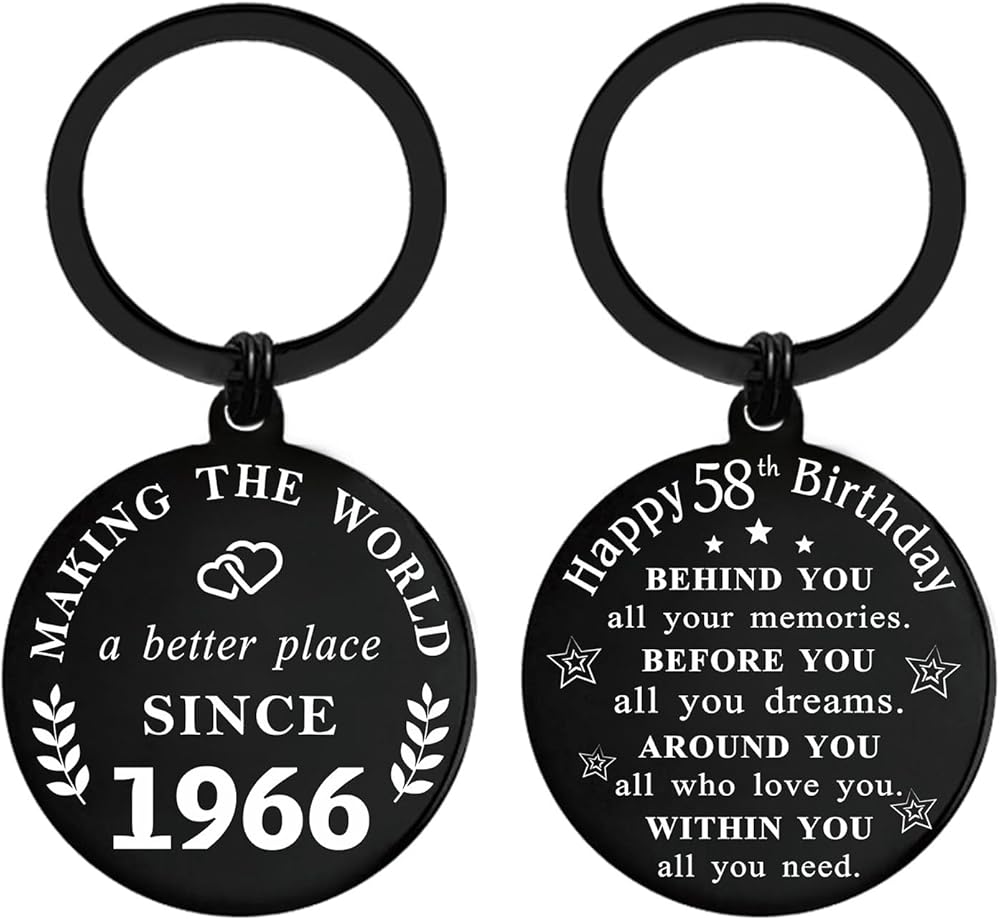 سلسلة مفاتيح لعيد الميلاد عام 1966 - الجانب الأمامي مكتوب عليه "جعل العالم مكانًا أفضل منذ عام 1966"، والجانب الخلفي مكتوب عليه "عيد ميلاد سعيد 58! خلفك، كل ذكرياتك. أمامك، كل أحلامك. من حولك، كل من تحب بداخلك كل ما تحتاجه."