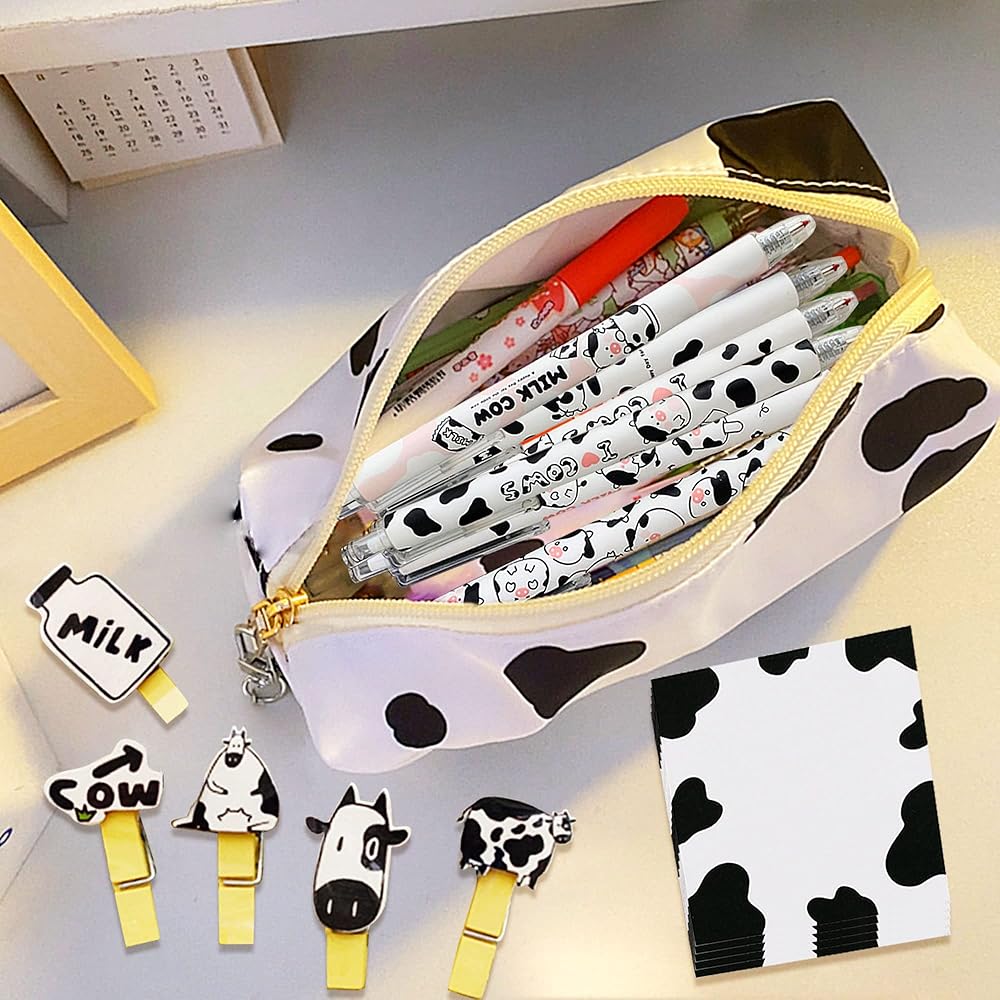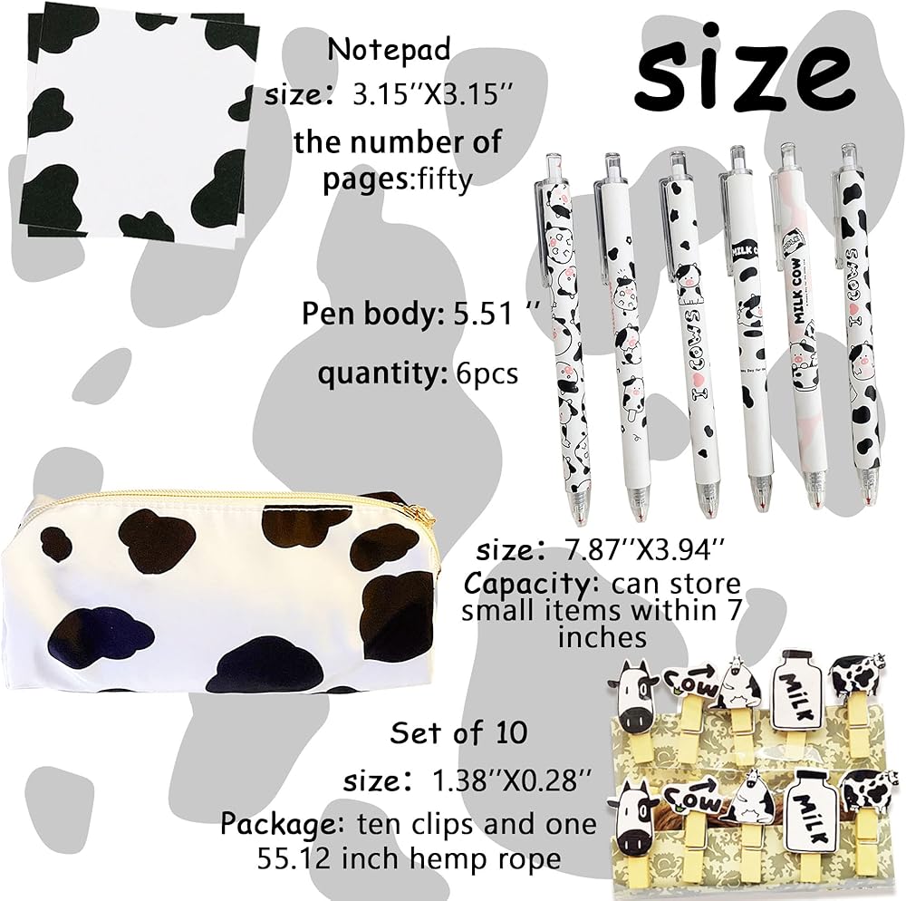 سوف تحصل على: 1 × حقيبة أقلام بقرة، 6 × أقلام بقرة، 10 × مشابك بقرة، 1 × ملاحظات لاصقة على شكل بقرة.