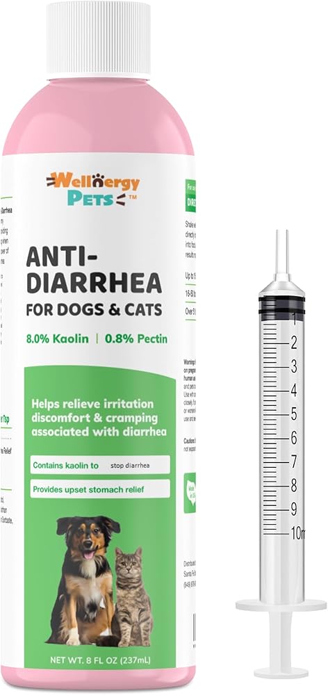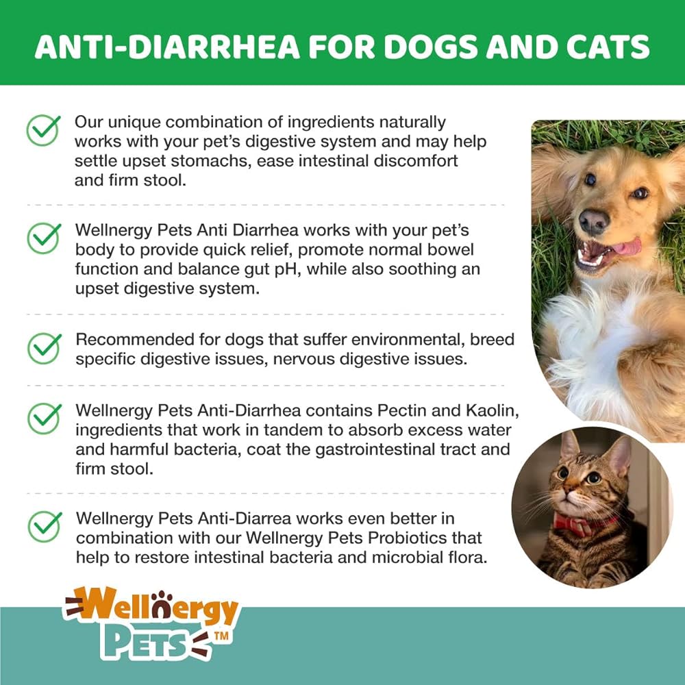 When your dog or cat is experiencing an upset stomach or intestinal issues that result in loose stool, they need relief! Our Wellnergy Pets Anti-Diarrhea for Dogs and Cats is a liquid that works to quickly help reduce loose stool and related issues. It helps to firm stool in dogs and cats, when occasional loose stool can be caused by stress, diet and environmental changes, among other factors. Wellnergy Pets Anti Diarrhea works with your pet's body to provide quick remedy, promote normal bowel function and balance gut pH, while also soothing an upset digestive system. Wellnergy Pets Anti-Diarrhea Liquid for dogs and cats contains two highly-effective, clinically used, and time tested ingredients: Kaolin – Absorbs water and excess bacteria to help soothe irritated intestines. Pectin – Absorbs water to help firm stool and provide relief from loose stool. Kaolin-Pectin works even better in combination with our Wellnergy Pets Probiotics that help to restore intestinal bacteria and microbial flora. Additional prebiotics in our probiotics formula help to make sure that the beneficial bacteria can find its way to the intestines to help restore healthy bacteria. Get your pet the relief it needs today for diarrhea, indigestion, and upset stomach whenever they're feeling under the weather with Wellnergy Pets Anti-Diarrhea for Dogs and Cats.