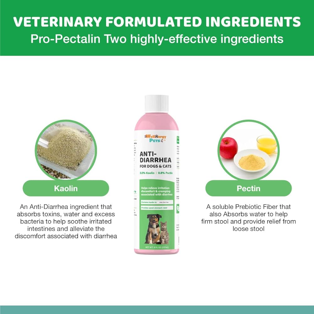 Wellnergy Pets Anti-Diarrhea Liquid for dogs and cats contains two highly-effective, clinically used, and time tested ingredients: