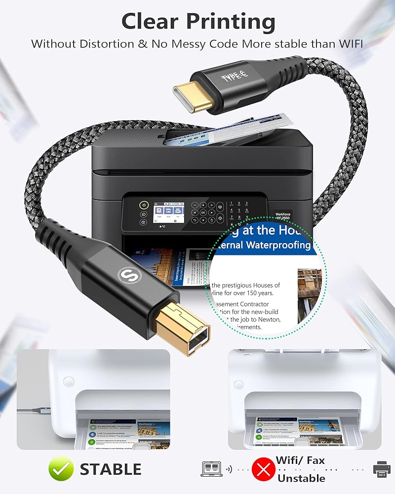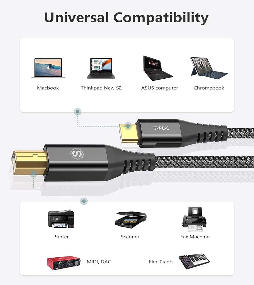 • 📢 [ كابل طابعة USB C ]: كابل طابعة sweguard يربط الأجهزة التي تدعم USB-C (MacBook Pro، Surface Book 2، Chromebook Pixe، إلخ) بأجهزة USB 2.0 من النوع B والأجهزة الطرفية، ذكر USB 2.0 B هو الجانب المستهدف، متوافق مع USB منفذ من النوع B (الطابعات القديمة، متعددة الوظائف، طابعة ليزر أو حرارية، ماسح ضوئي للمستندات المكتبية، بيانو Yamaha Casio الرقمي، وحدة تحكم MIDI، لوحة مفاتيح كهربائية، إلخ.)