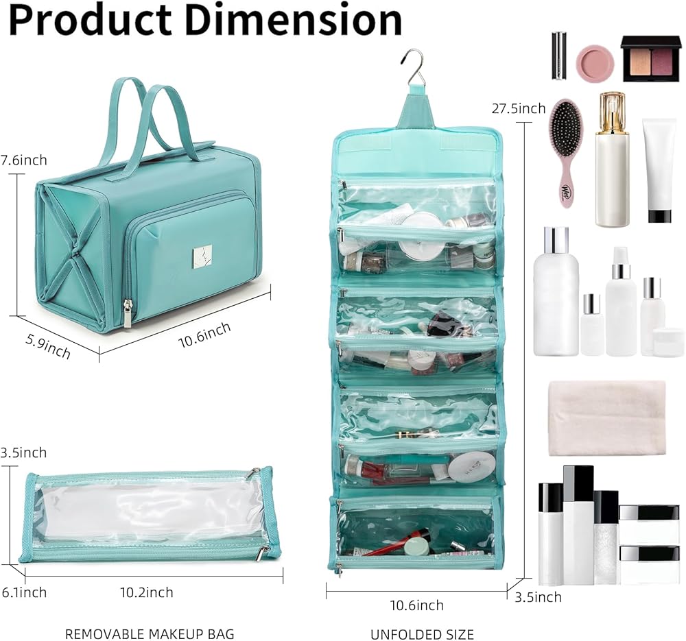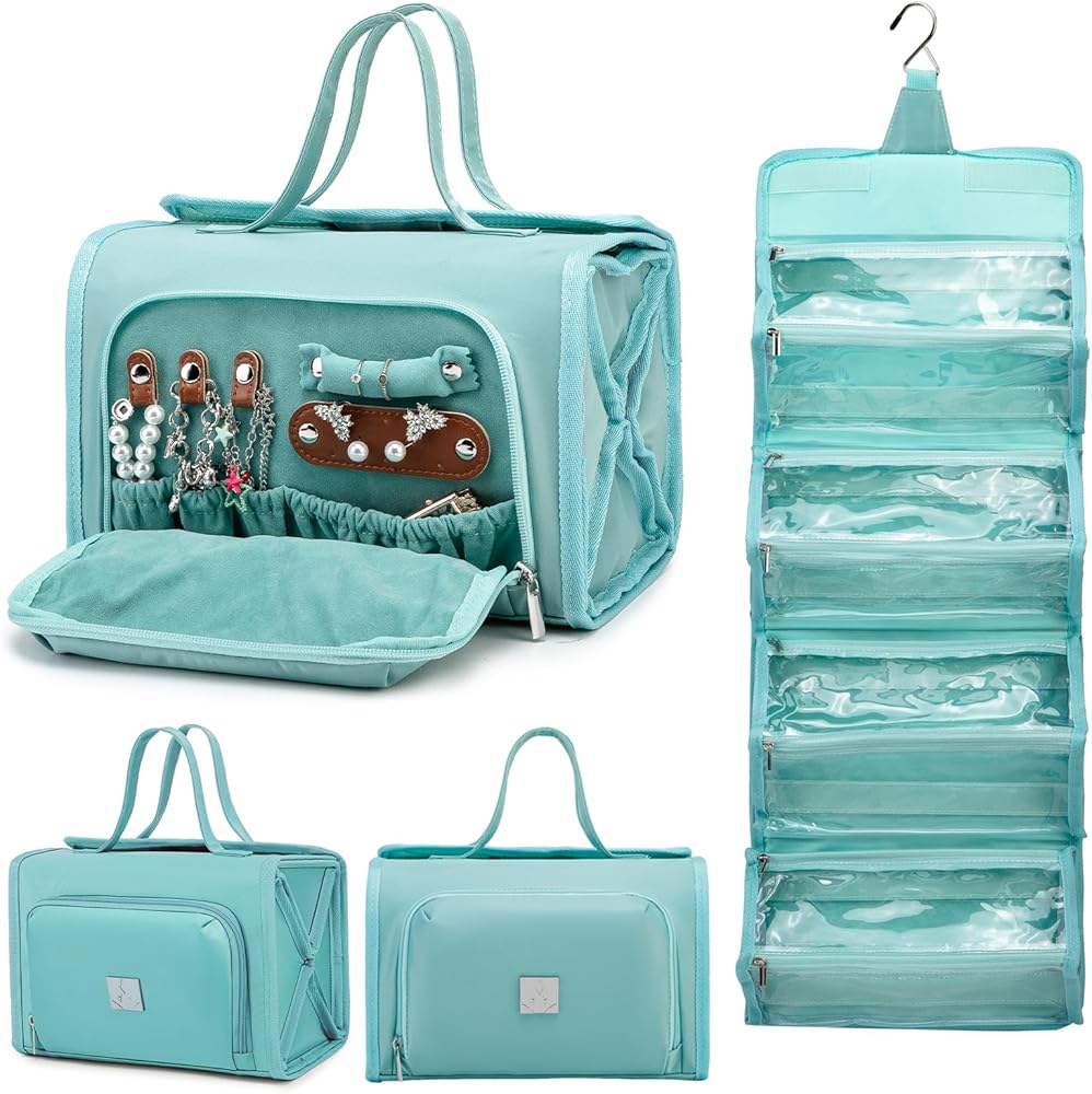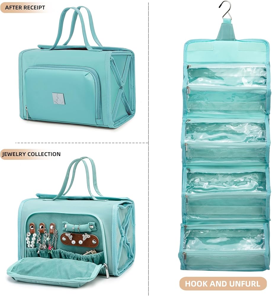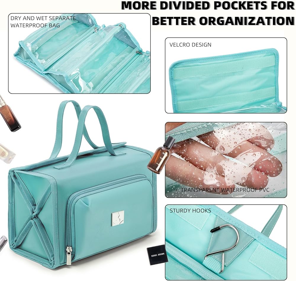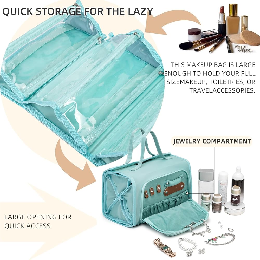 [تصميم فريد] 4 مقصورات (قابلة للإزالة) حقيبة مكياج قابلة للطي للسفر وحجرة مجوهرات خاصة، يمكنك بسهولة وضع منتجات الغسيل والمجوهرات بشكل منفصل لتنظيم رحلتك. ، العناية الشخصية، حقيبة تنظيم مستحضرات التجميل مصنوعة من قماش قوي وسحابات عالية الجودة للحفاظ على مكياجك وممتلكاتك الشخصية - سواء كانت ملفوفة أو معلقة على باب الحمام.