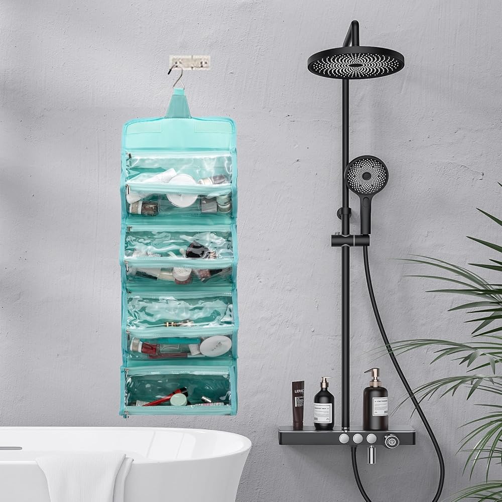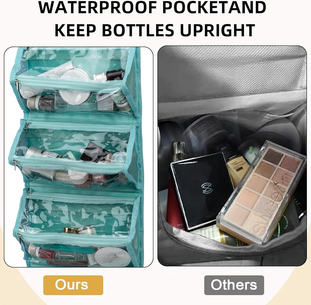 [سهلة التنظيم] ستساعدك المقصورات الأربعة على فرز وتخزين متعلقاتك. عندما تكون مفتوحة ومعلقة، سيتم اصطفاف جميع الجيوب الشفافة بالداخل أمامك، ويمكنك وضع أنواع مختلفة من العناصر في أكياس مختلفة - شفافة ونظيفة - مما يجعل من السهل عليك العثور على ما تحتاجه.