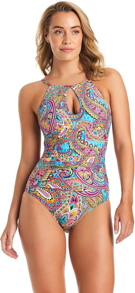 High neck over-the-shoulder one-piece swimsuit featuring keyhole, drape at midsection, and removable cups.