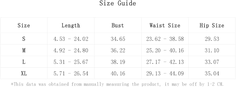 S:Bust:34.6IN,Hip Size:29.5IN,Length:4.5/24.0IN,Waist Size:23.6-38.6IN