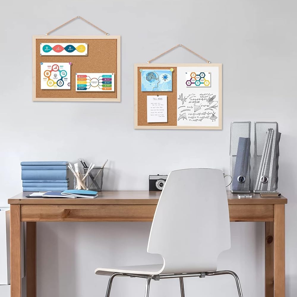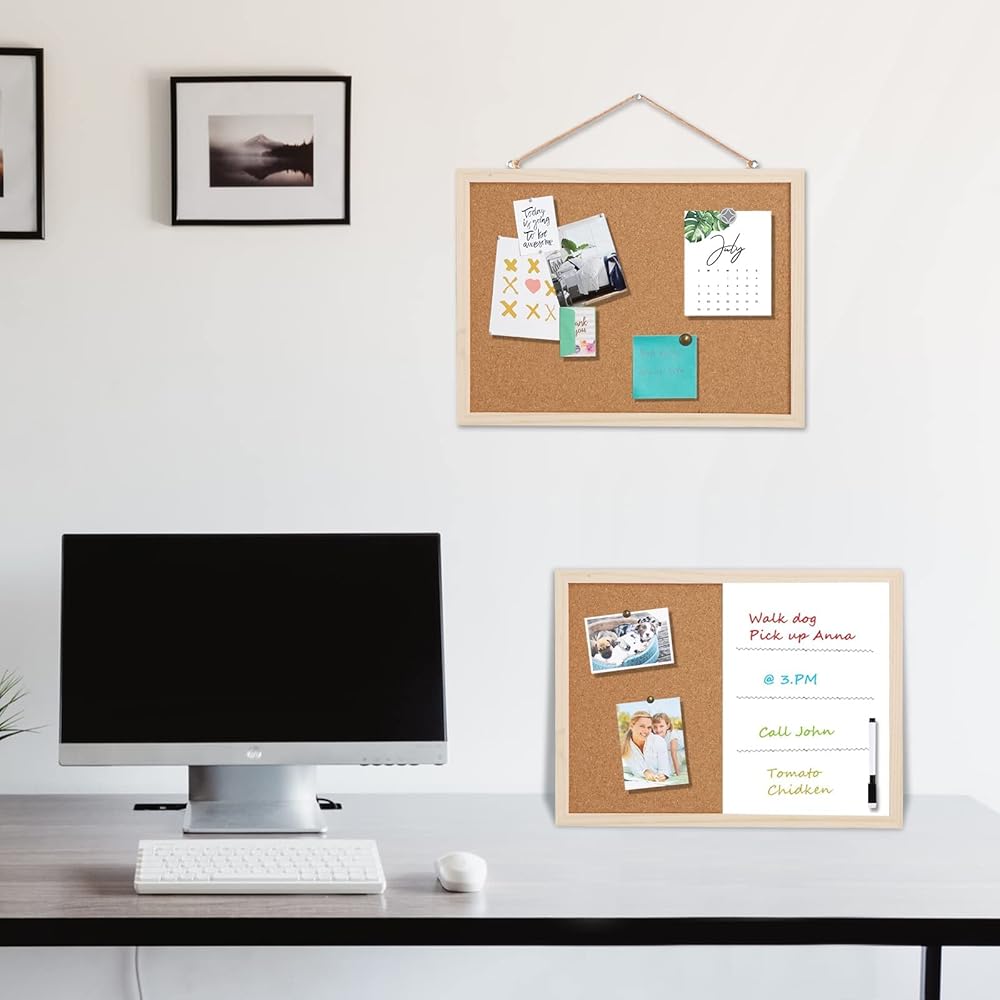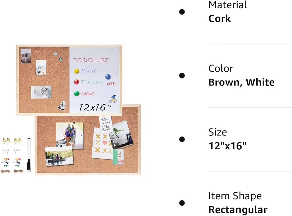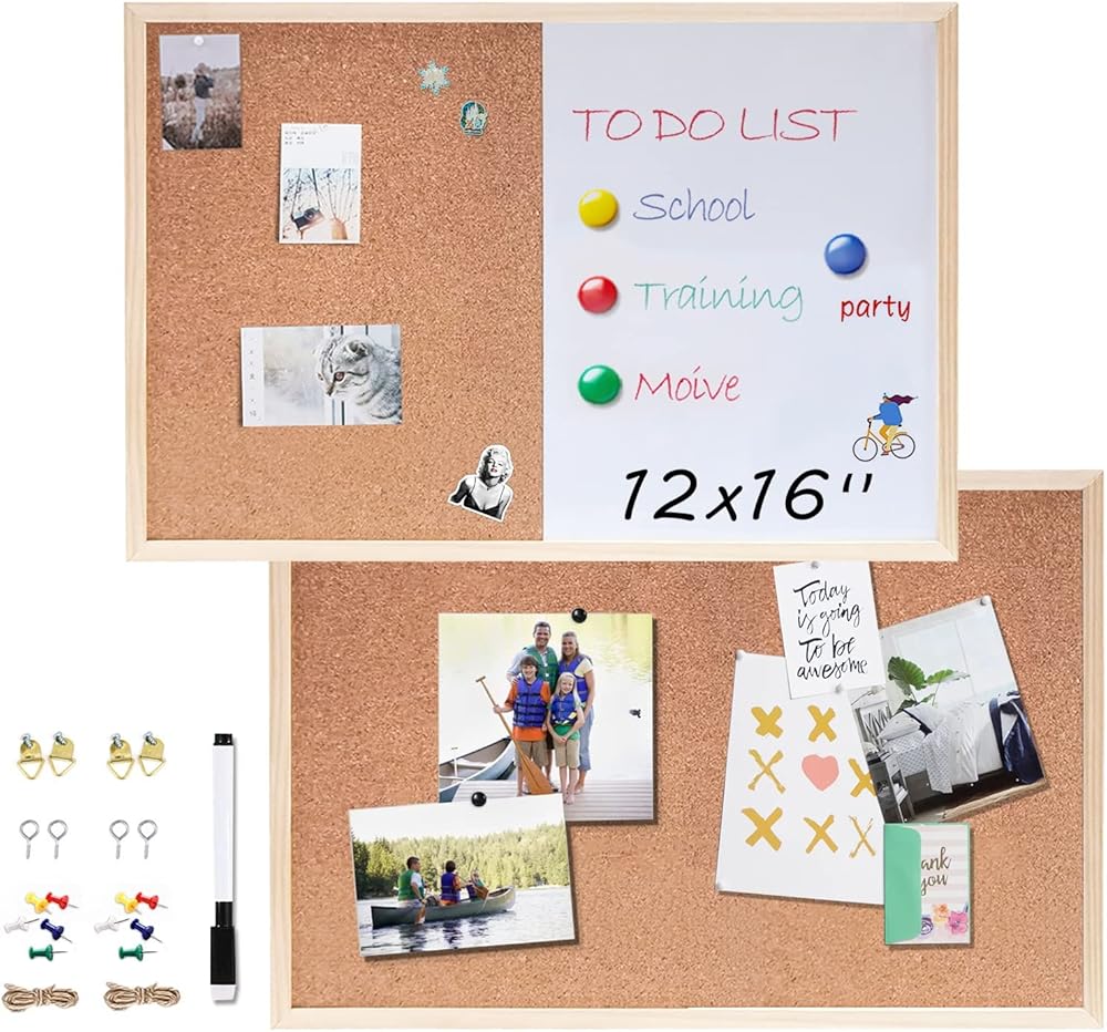 2 حزمة لوحة إعلانات 16 × 12 بوصة (1 لوحة فلين + 1 مجموعة سبورة بيضاء من الفلين)، لوحة فلين معلقة للجدران بإطار خشبي، لوحة رؤية لوحة إشعارات لعرض جداول الصور والمذكرات