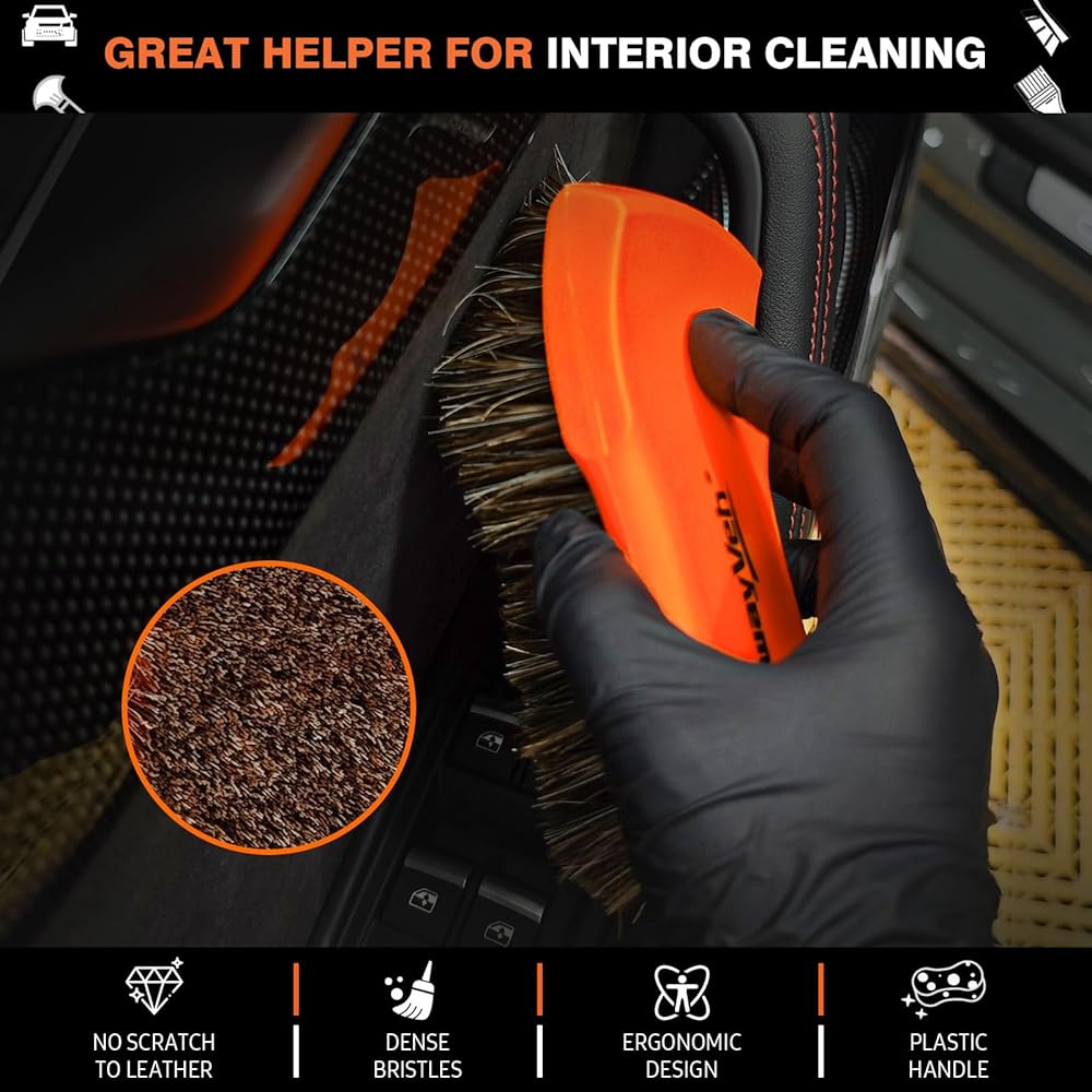 • [تنظيف لطيف وفعال]: توفر شعيرات شعر الحصان الناعمة والناعمة الموجودة على فرشاة التنظيف الجلدية لمسة لطيفة، مما يجعلها مثالية للأسطح الحساسة مثل الأجزاء الداخلية للسيارة والمقاعد الجلدية ولوحات القيادة. فرشاة شعر الحصان تزيل الغبار والأوساخ والحطام بشكل فعال دون خدش أو إتلاف السطح.