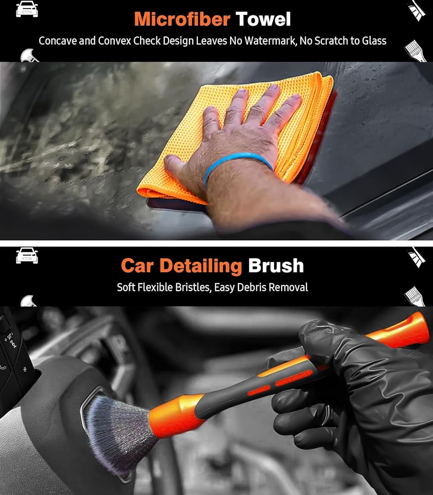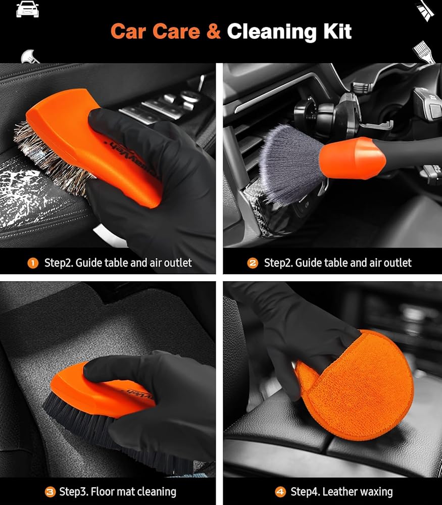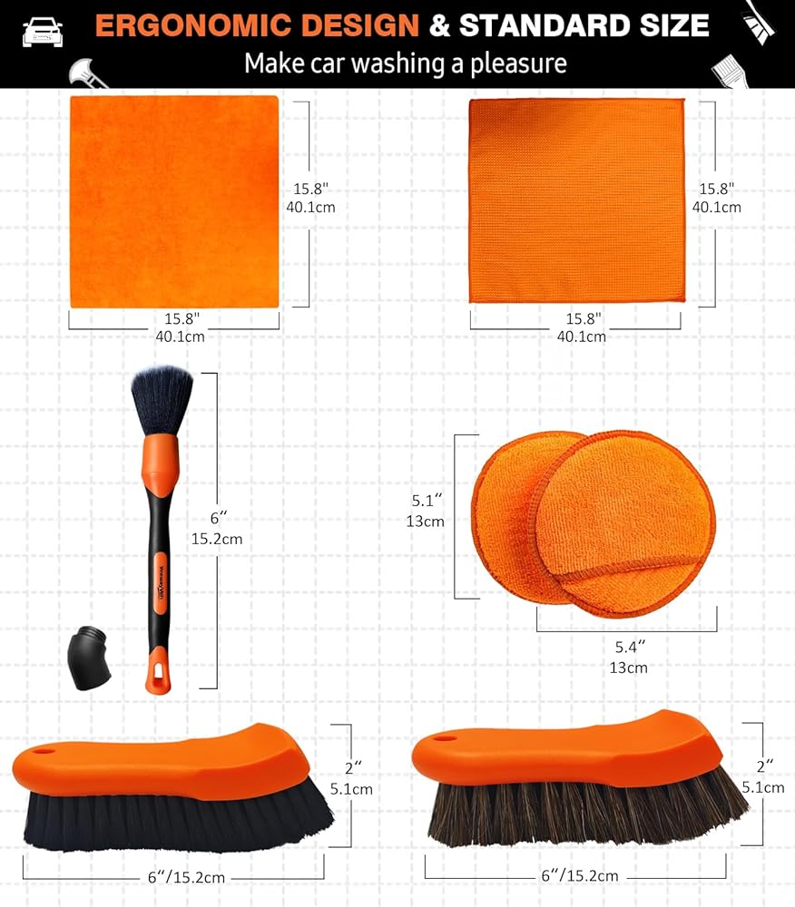 طقم تنظيف داخلي للسيارة مكون من 7 قطع مع فرشاة جلدية من شعر الحصان لمقعد السيارة، وفرشاة السجاد وفرشاة تفصيل السيارة، ومنشفة من الألياف الدقيقة ووسادات لوضع الشمع لتنظيف السيارة والعناية بها، برتقالي