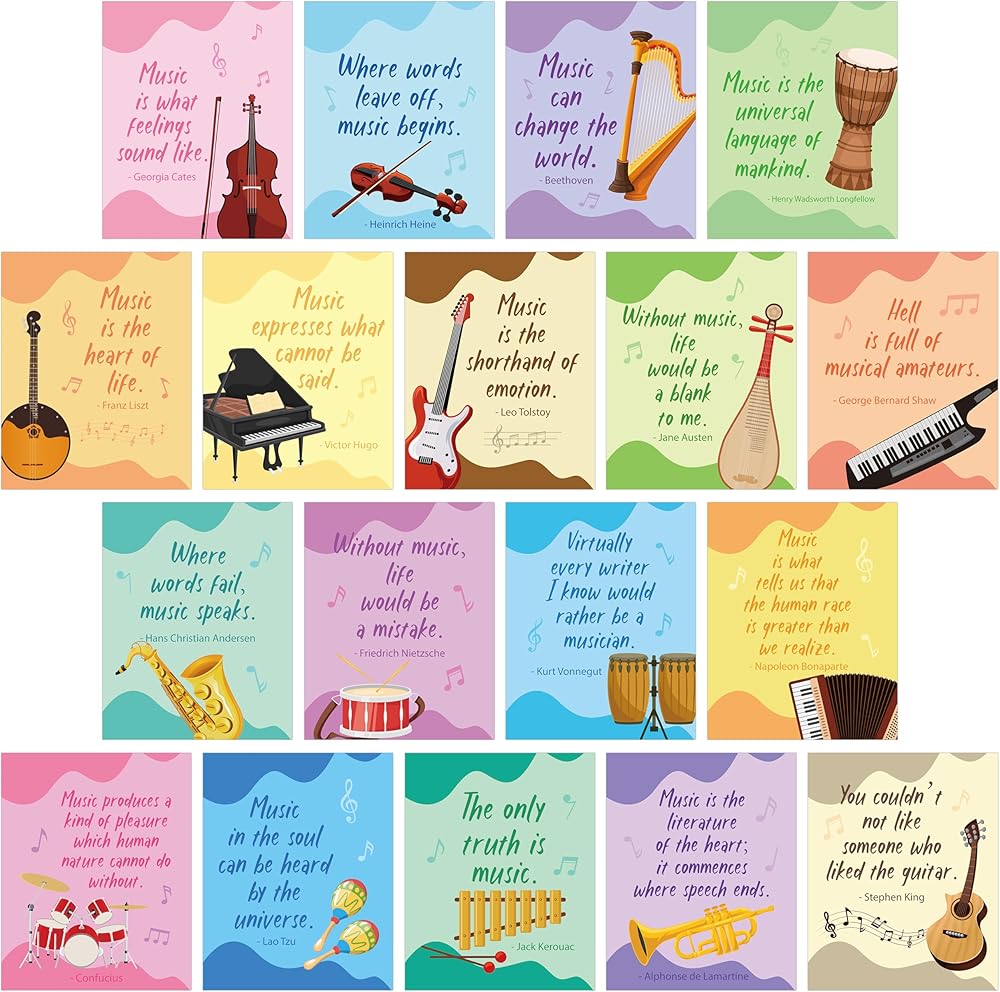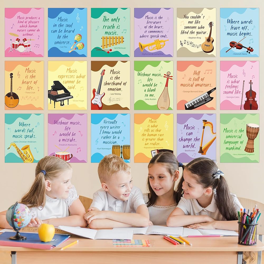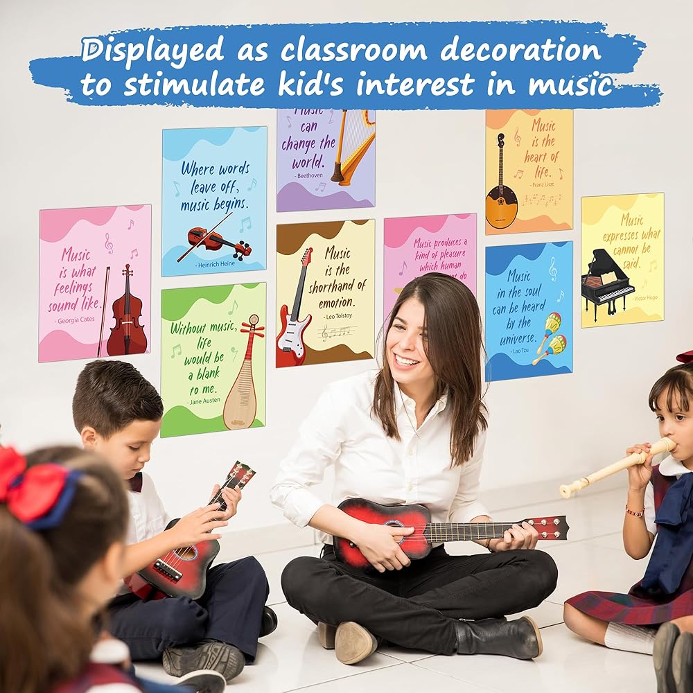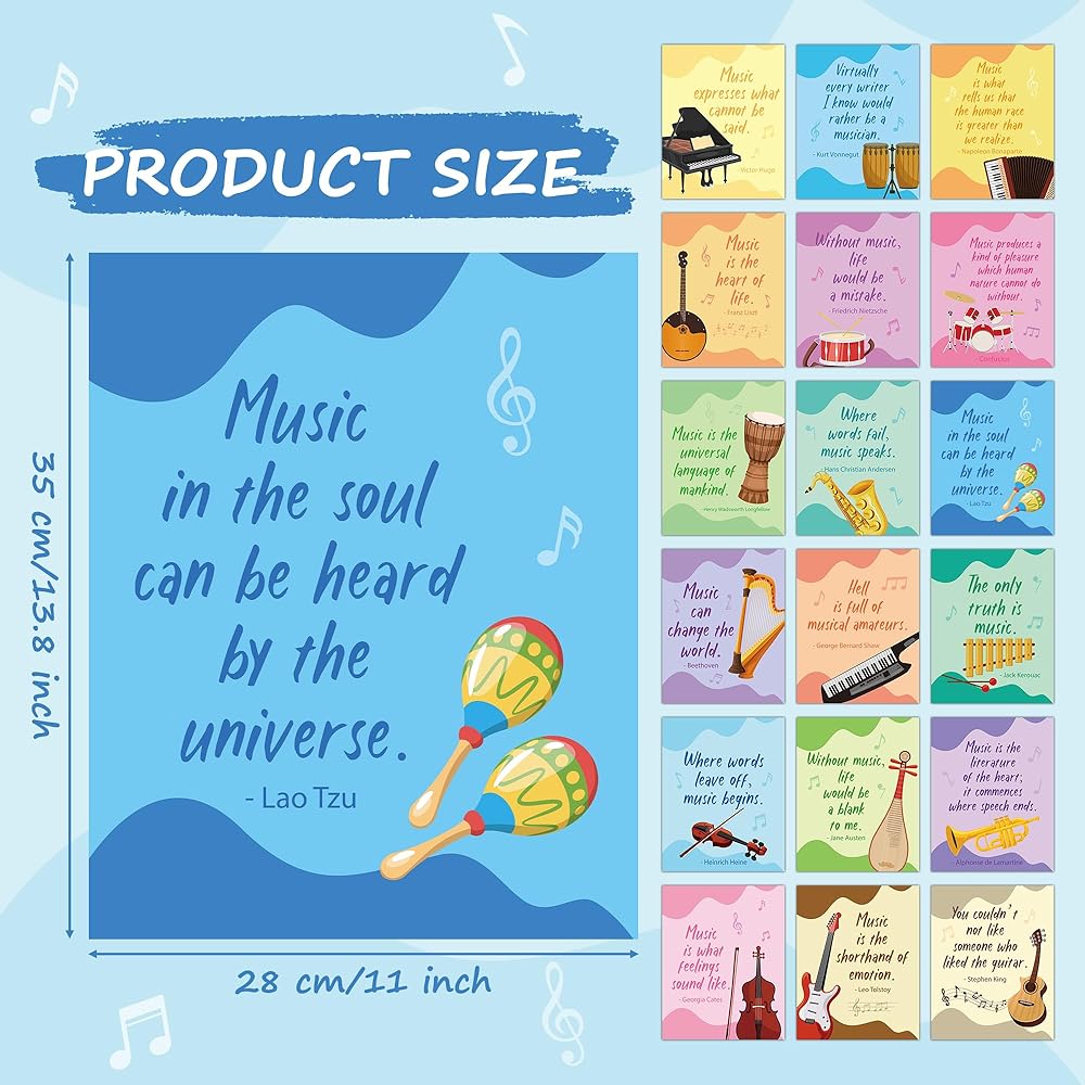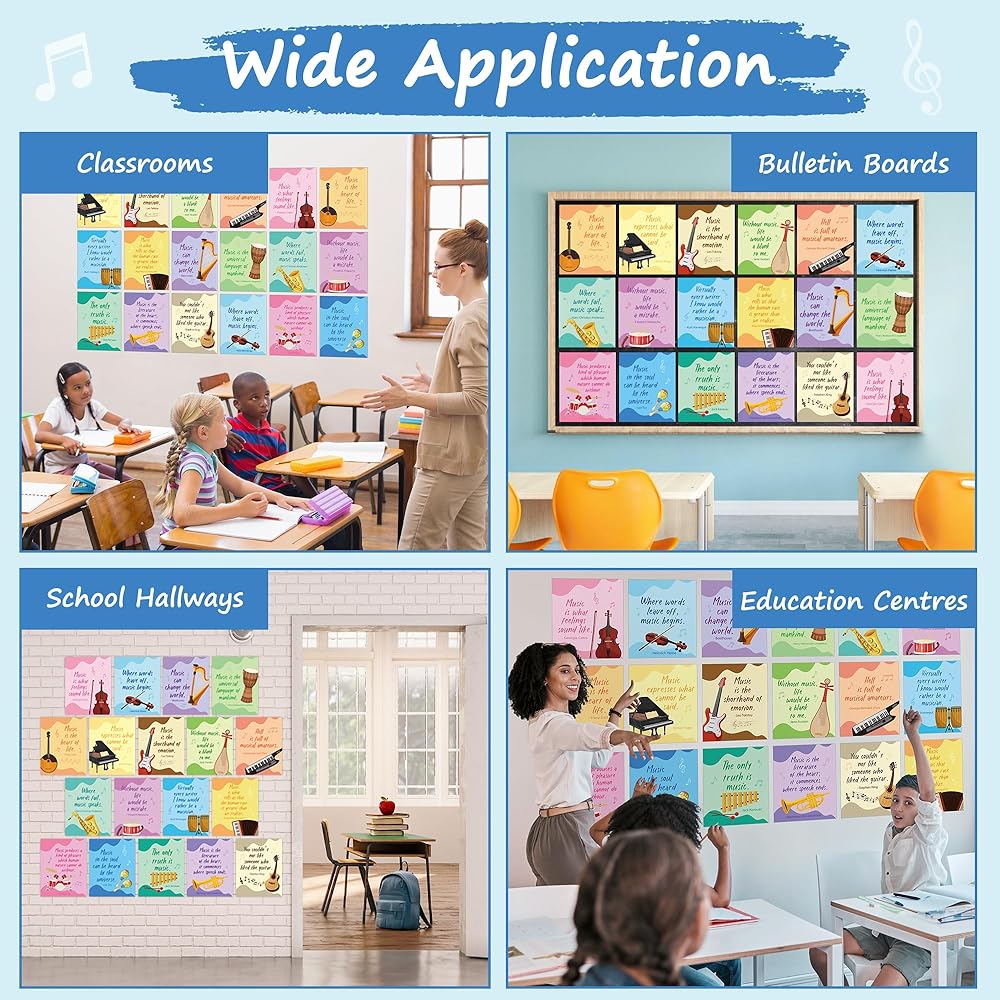 القيمة التعليمية: بالإضافة إلى دورها الزخرفي، فإن الملصقات لها أيضًا قيمة تعليمية. يمكن استخدامها في الفصول الدراسية أو استوديوهات الموسيقى أو المنازل لتعليم وإلهام المناقشات حول نظرية الموسيقى وتاريخها وتقديرها.