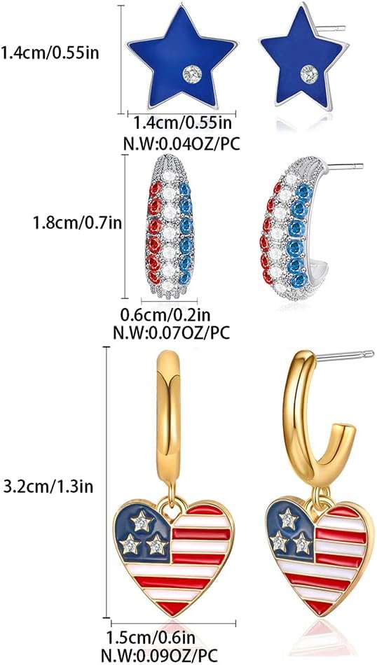 • ❤️ثلاثة أزواج في مجموعة واحدة: تتضمن مجموعة الأقراط هذه زوجين من الأقراط الحلقية، تتميز بأزرار على شكل نجمة حمراء وزرقاء، وأقراط متدلية على شكل قلب، وأطواق مرصوفة بأحجار الراين/أطواق ذهبية، مما يمنحك مجموعة متنوعة من الخيارات للاختيار من بينها لتناسب ملابسك و مناسبات.