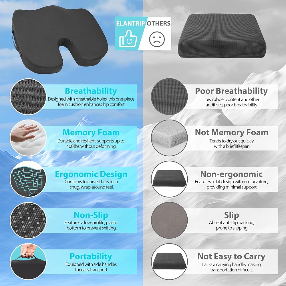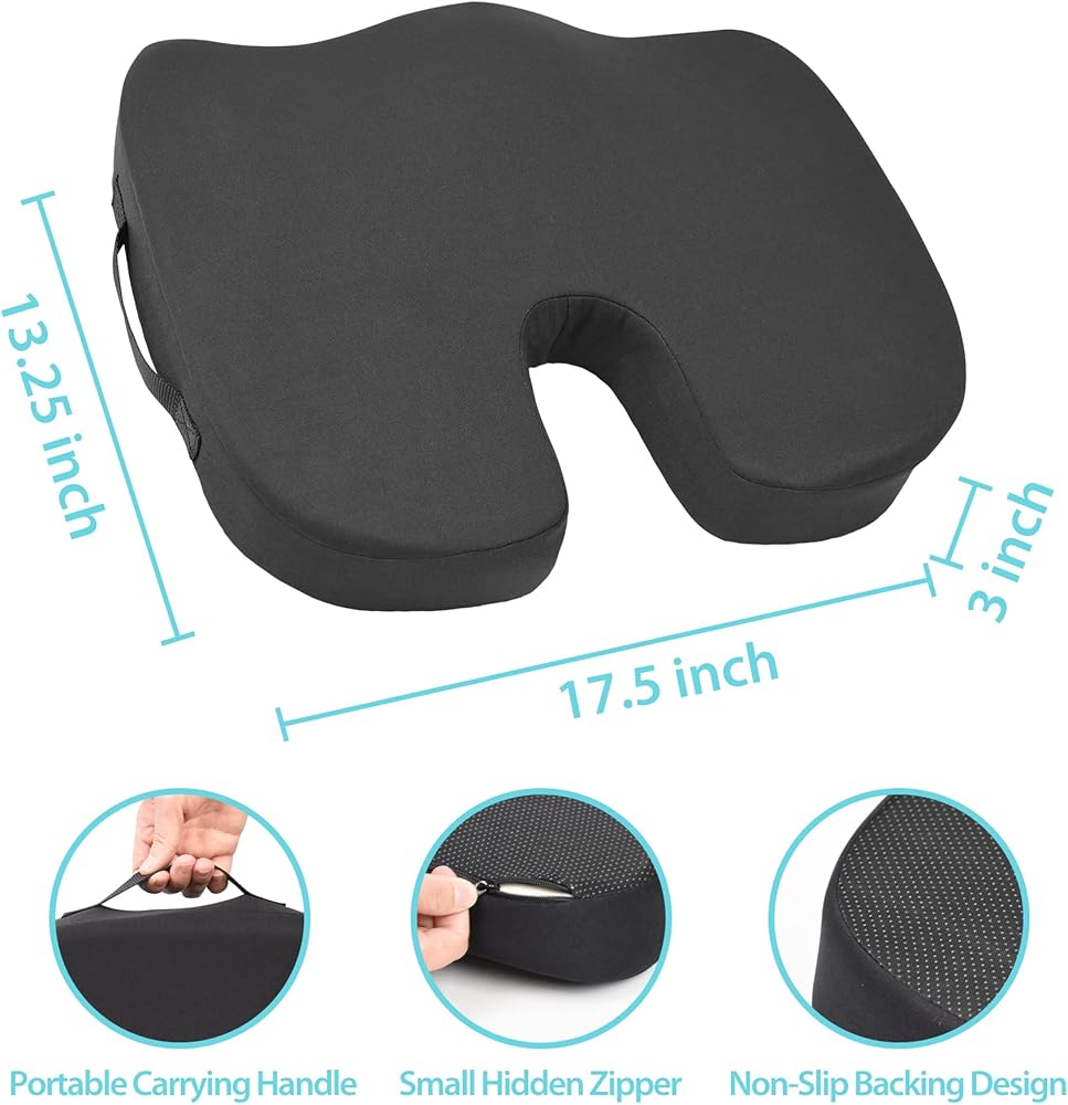 • تصميم تخفيف الألم: تم تصميم وسادتنا لتقليل الانزعاج في أسفل الظهر والأرداف والحوض، وهي مثالية للمحترفين الذين يقضون ساعات في الجلوس. يعمل تصميمه المريح على تخفيف آلام عظمة الذنب بسرعة وتخفيف نقاط الضغط أثناء القيادة الطويلة أو ساعات العمل الممتدة.