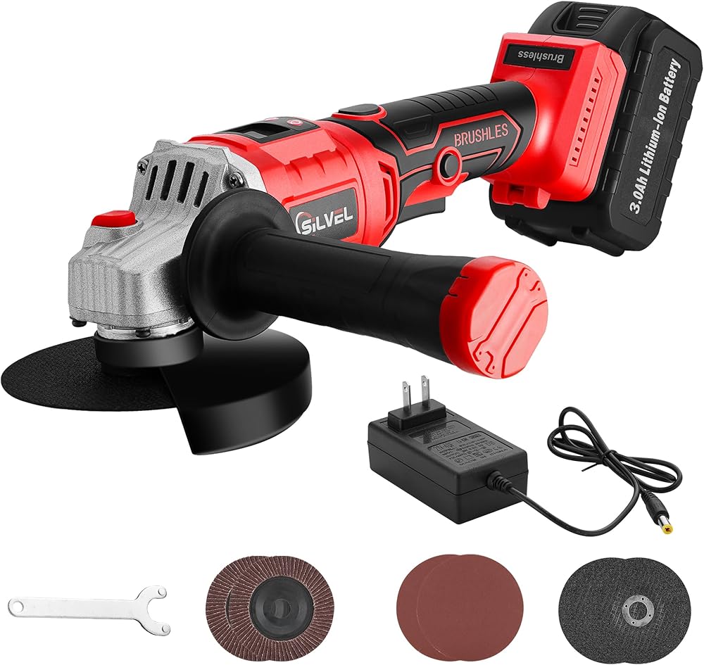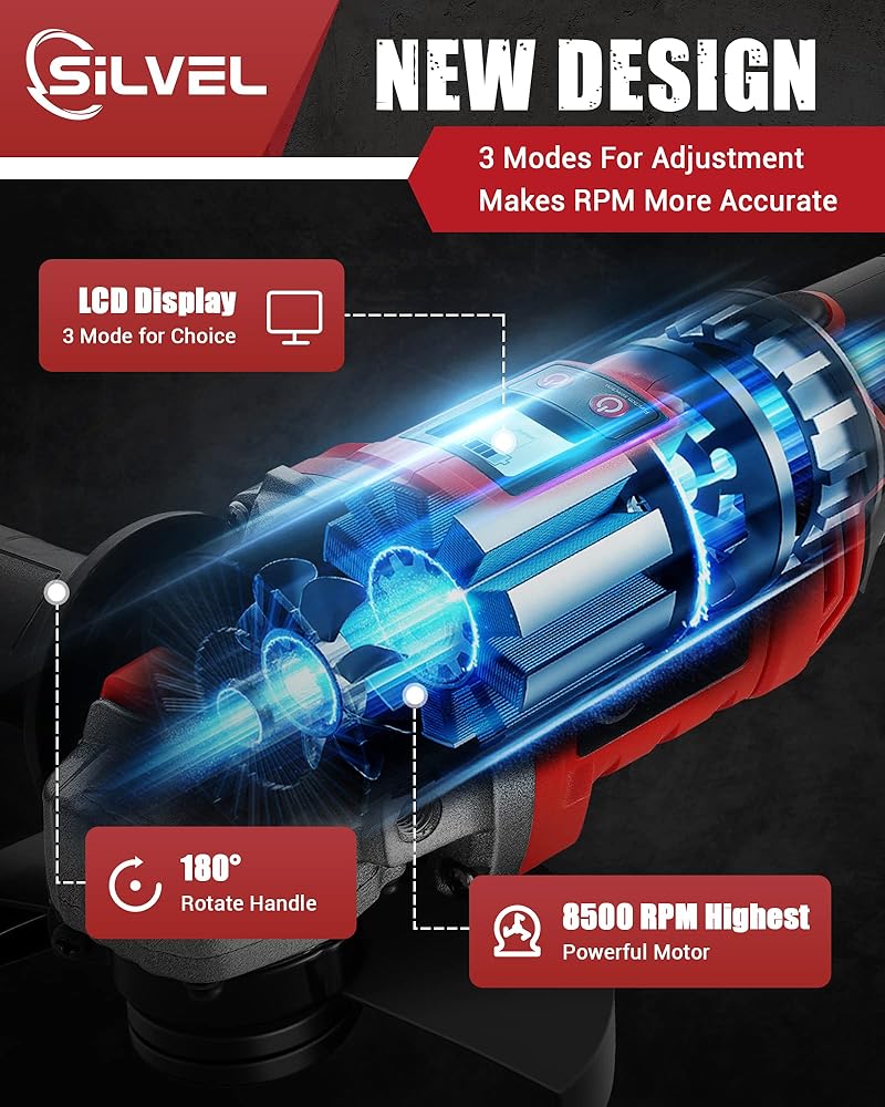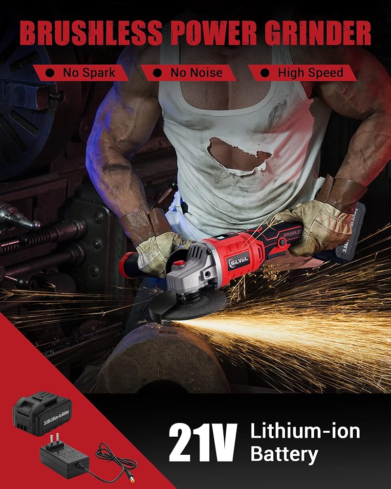 مطحنة زاوية لاسلكية 21 فولت من SILVEL، مطحنة لاسلكية 5 بوصة 8500 دورة في الدقيقة مع بطارية ليثيوم أيون 4.0 أمبير في الساعة، شاحن، مقبض بموضعين، مطحنة زاوية كهربائية للمعادن والخشب
