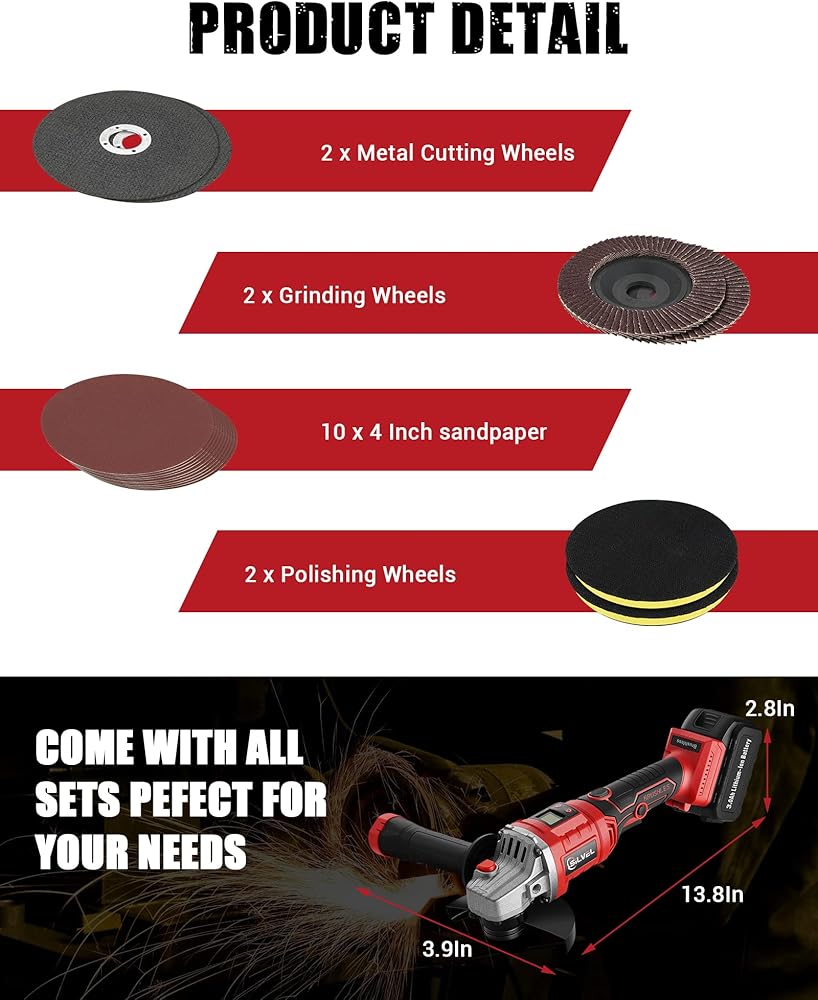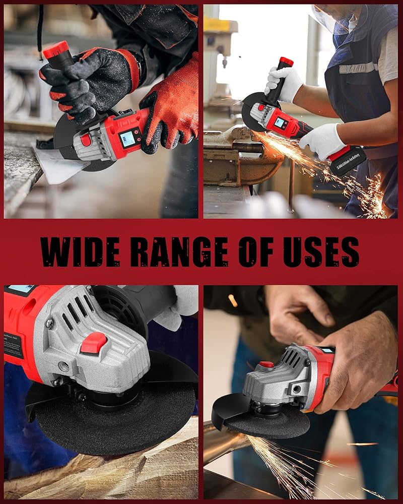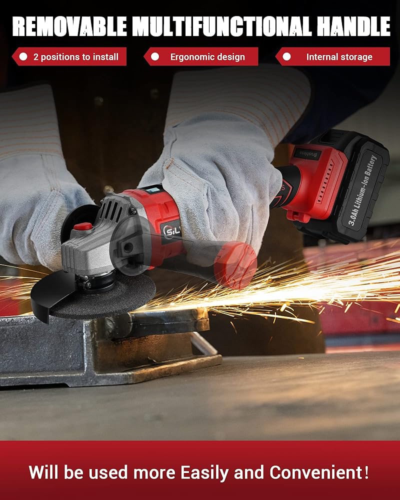 【طاقة لاسلكية ومتصلة جاهزة】- تعمل بدون سلك على التخلص من مشكلة الكابلات الملتفة وتوفر راحة كبيرة للحمل، وهي مناسبة للاستخدام الداخلي والخارجي. وفي الوقت نفسه، مجهزة ببطارية ليثيوم أيون قابلة لإعادة الشحن ذات سعة كبيرة 21 فولت 4.0 أمبير وشاحن، يمكنها الحفاظ على عمل طاحونة الزاوية اللاسلكية بثبات لفترة طويلة.