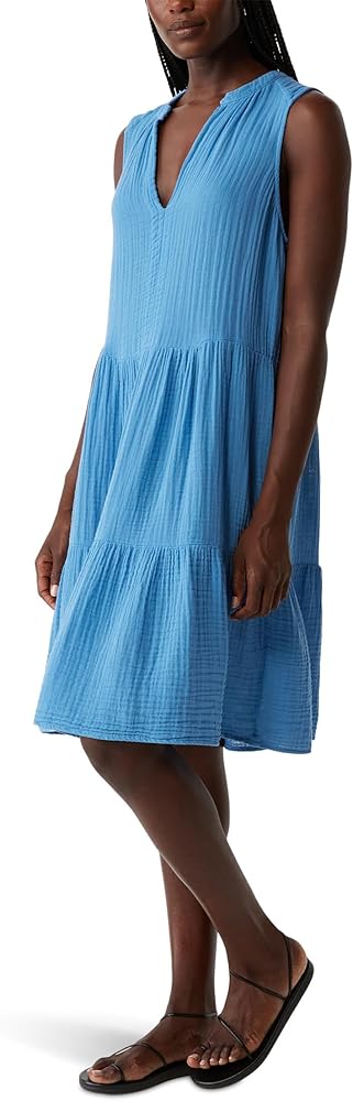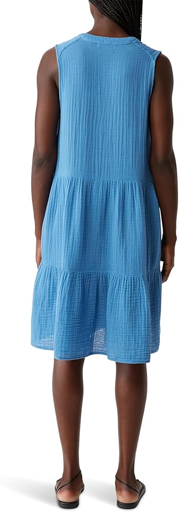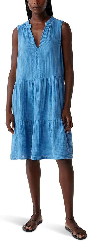 مريح وسهل الطراز: فستان ديزي أنيق وبسيط بدون أكمام مصنوع من شاش مزدوج سهل الارتداء، مع رقبة مشقوقة وتنورة ذات طبقات على خصر إمبراطوري.