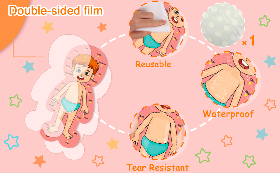 محتويات العبوة: تتضمن مجموعة لوحات إعلانات الجسم البشري 40 قطعة من النقاط اللاصقة، و4 رسوم بيانية جدارية لتعلم أجزاء الجسم، وهذه البطاقات مشرقة وملونة.