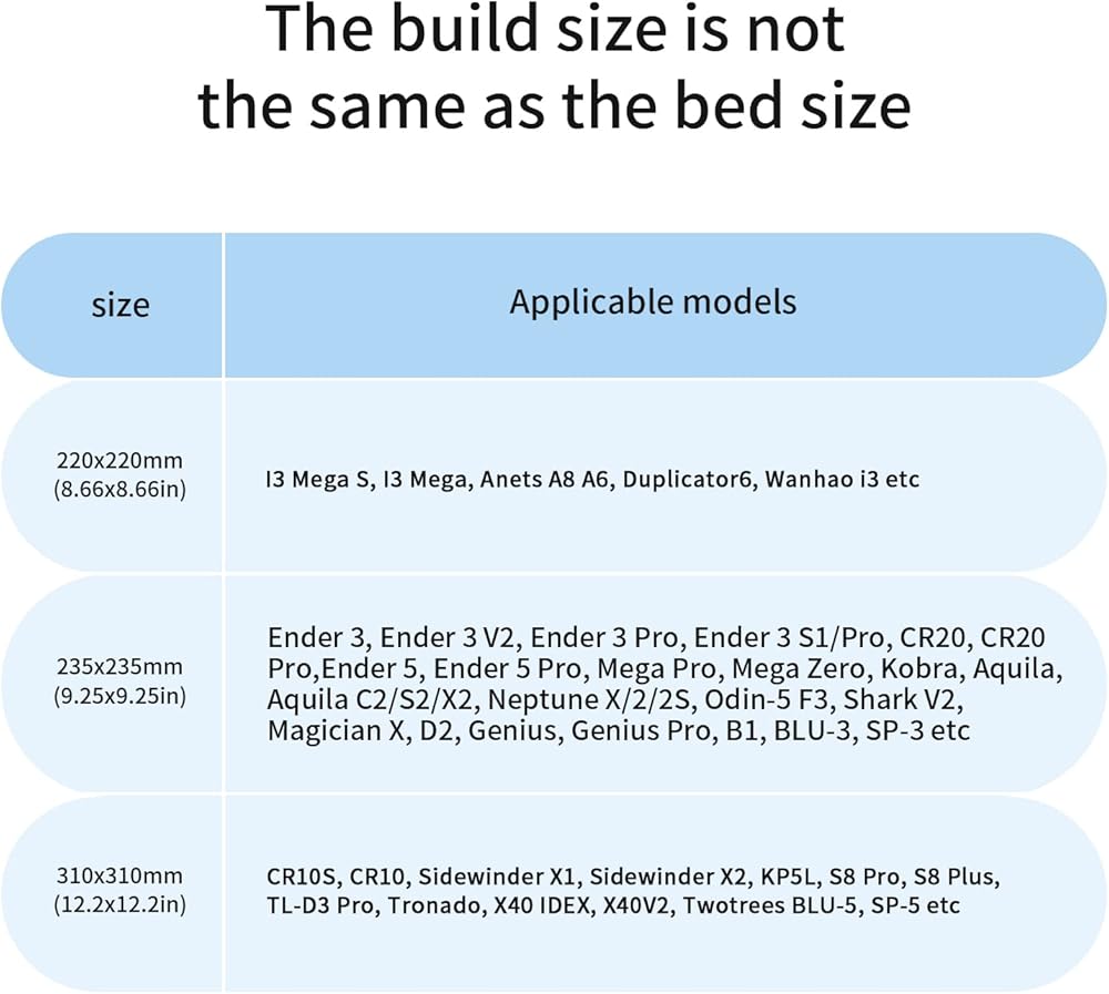 【التوافق: حجم ورقة PEI هو 310*310 مم، غير ملتوية. وهو متوافق مع معظم الطابعات الموجودة في السوق بحجم بناء 300*300 ملم. إنها مناسبة لـ CR10/CR10S، X40 IDEX/X40 V2، KP5L، S8 Pro/Plus، Sidewinder X1 X2، TL-D3 Pro، Twotrees SP-5، BLU-5/ Bluer Plus والطابعات ثلاثية الأبعاد الأخرى. إذا كانت الطابعة ثلاثية الأبعاد الخاصة بك تحتوي على منصة سرير حراري مقاس 310 × 310 مم، فإن ورقة PEI هذه متوافقة مع الطابعة ثلاثية الأبعاد الخاصة بك.