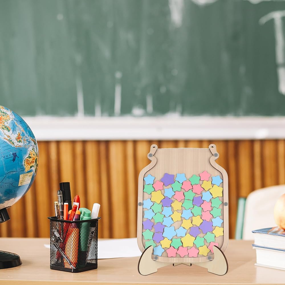 4 برطمانات مكافآت للفصل الدراسي - يبلغ مقاس الجرة النجمية 12 بوصة × 9 بوصة (30 سم × 22 سم) وتتضمن برطمانًا خشبيًا و100 مكعب خشبي على شكل نجمة بألوان وأحجام مختلفة، وحامل قابل للطي، وحبل تعليق.