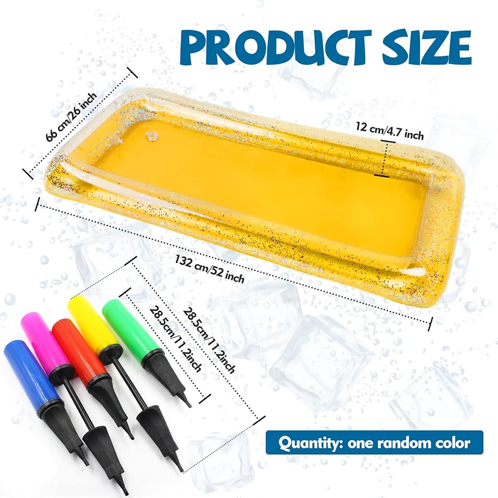 Proper Size: the inflatable drink holder measures about 0.2 cm thick, 52 inches/ 132 cm in length, 26 inches/ 66 cm width, 4.7 inches/ 12 cm in height, and it can hold sufficient beverage drinks and food and keep them cool on hot days