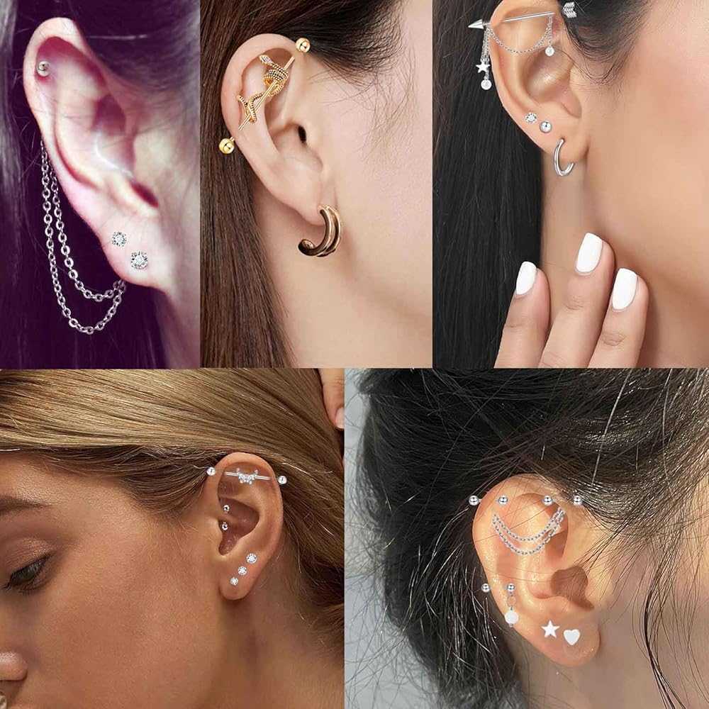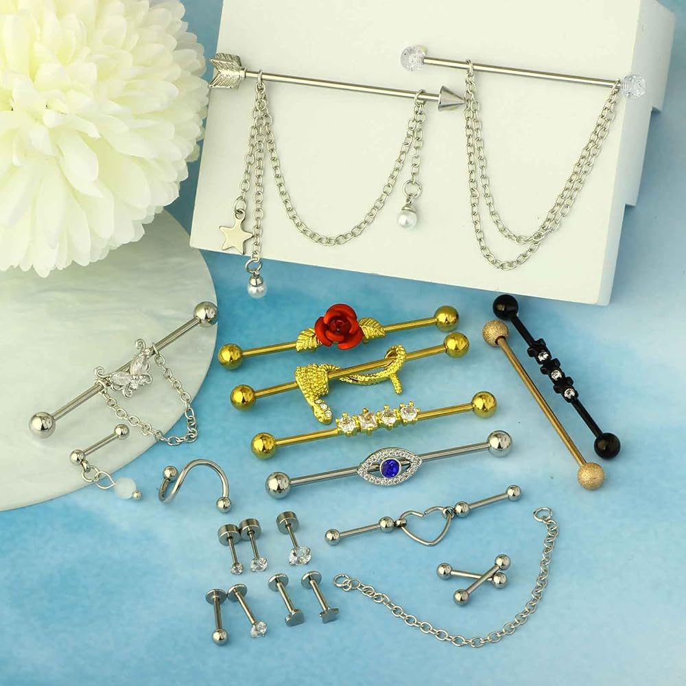 INDUSTRIAL PIERCING JEWELRY SET--One Order Includes 10 Pcs Industrial Barbells, 3 Pcs Barbell Rings, 4 Pcs Labret Studs, 3 Pcs Stud Earrings, 2Pcs Twisted Earring and 4 Pcs Cartilage Earring Chain.You can wear it individually or multiple at a time, Meet Your Multiple Ear Piercing Needs.