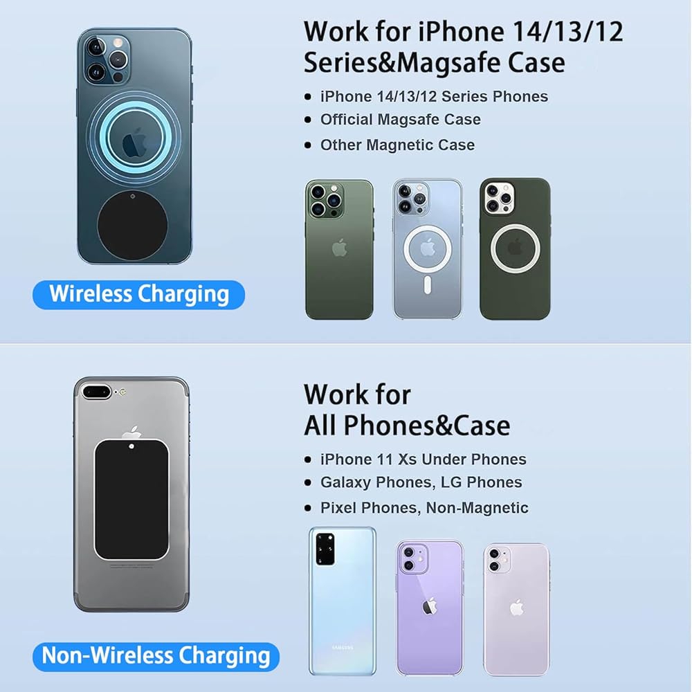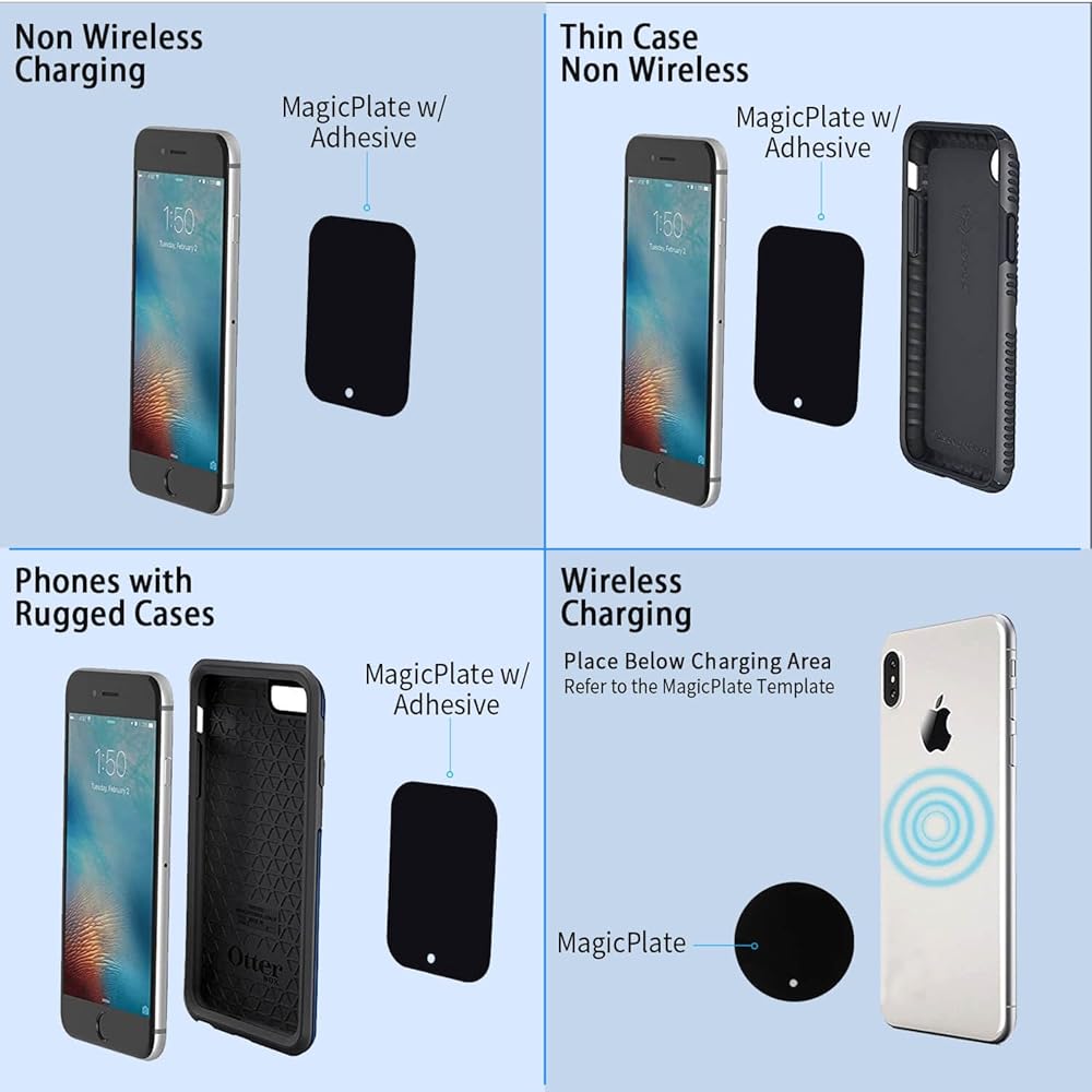 • يعمل مع جميع الهواتف: يأتي حامل الهاتف المغناطيسي للسيارة CARFIB مع لوحتين معدنيتين إضافيتين، مما يجعله مناسبًا أيضًا لجميع الهواتف ذات الجرابات الشائعة أو حافظات Magsafe. كل ما عليك فعله هو لصق الحلقة المعدنية بالطريقة الصحيحة. ملاحظة: هذا لا يمكن للمنتج أن يعمل مع MagSafe.