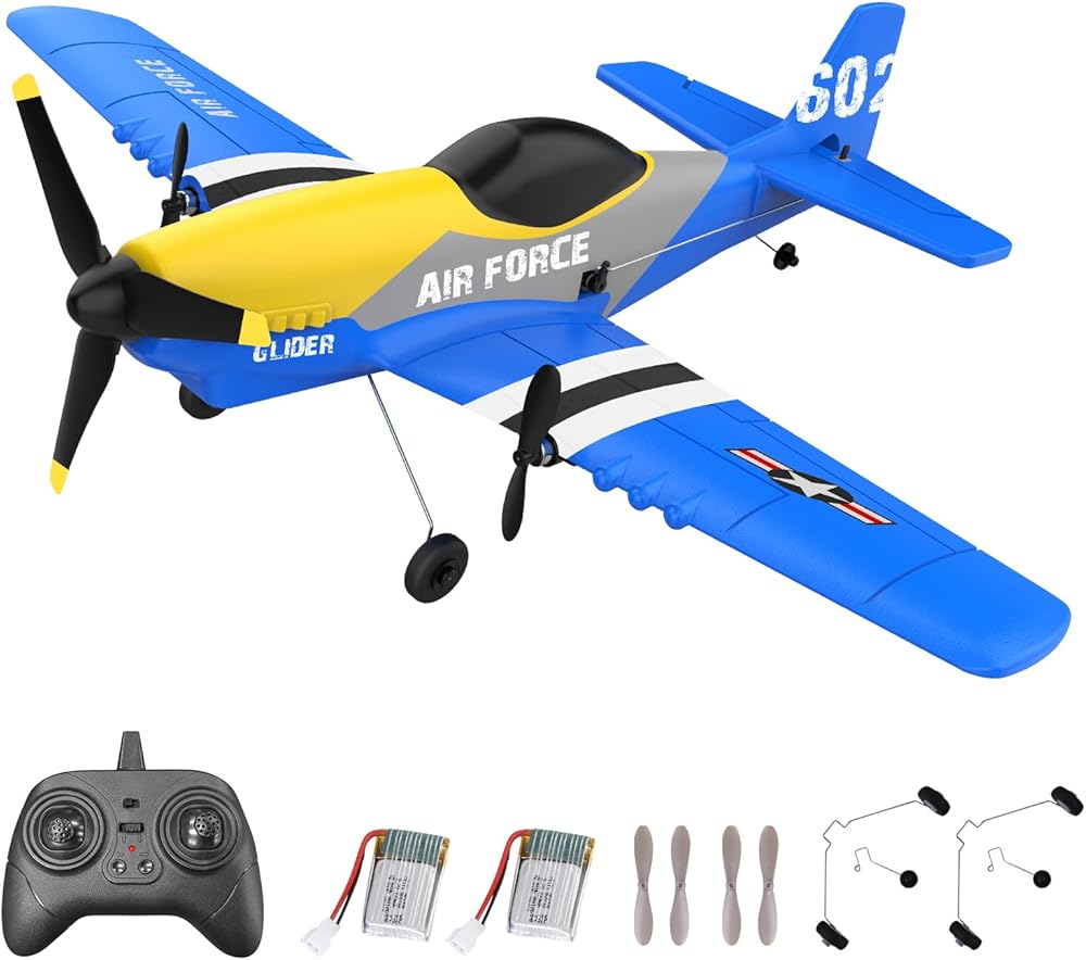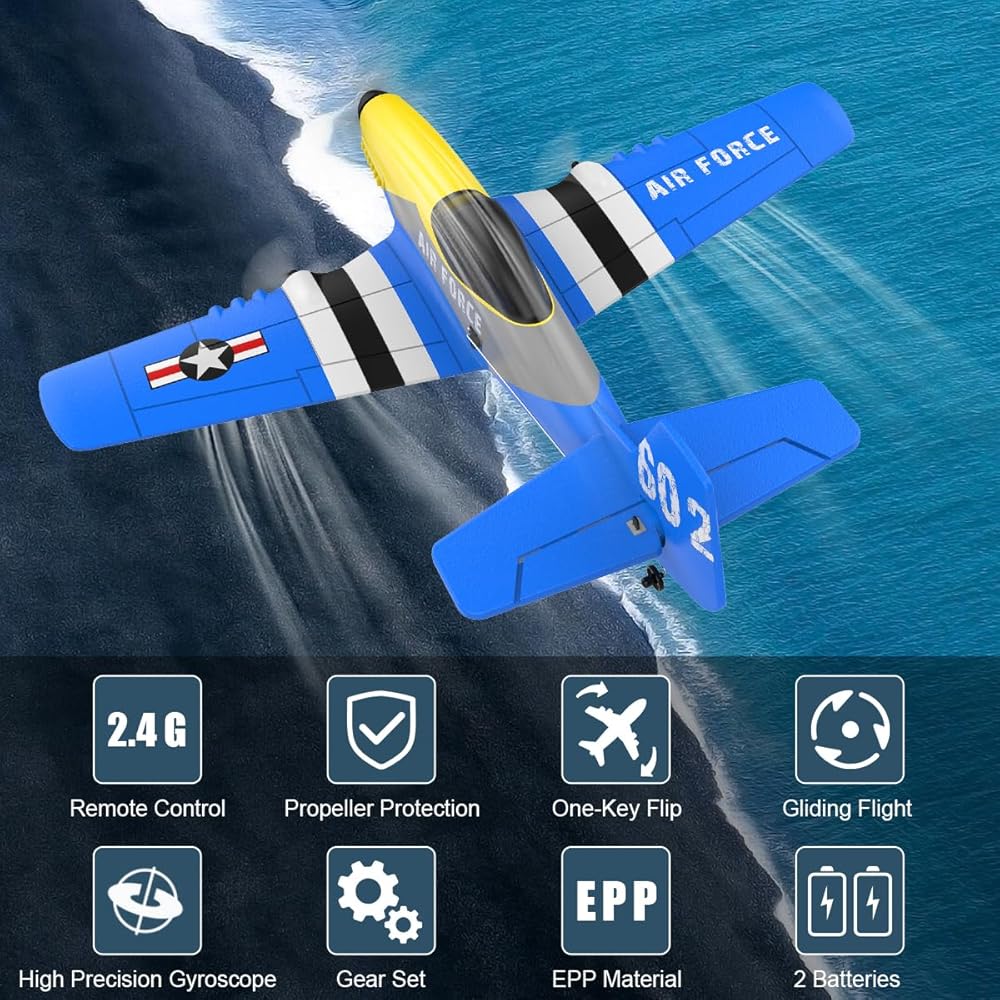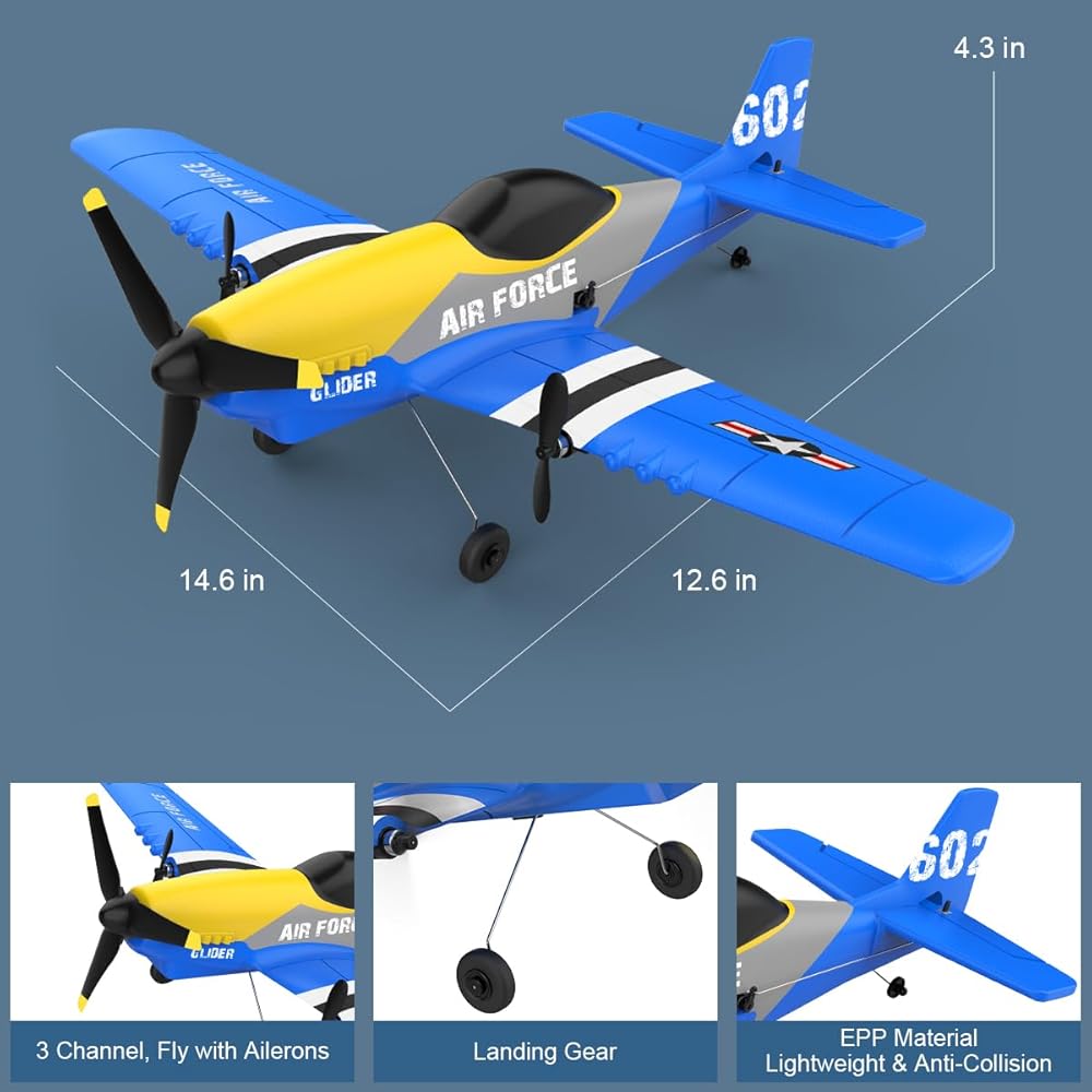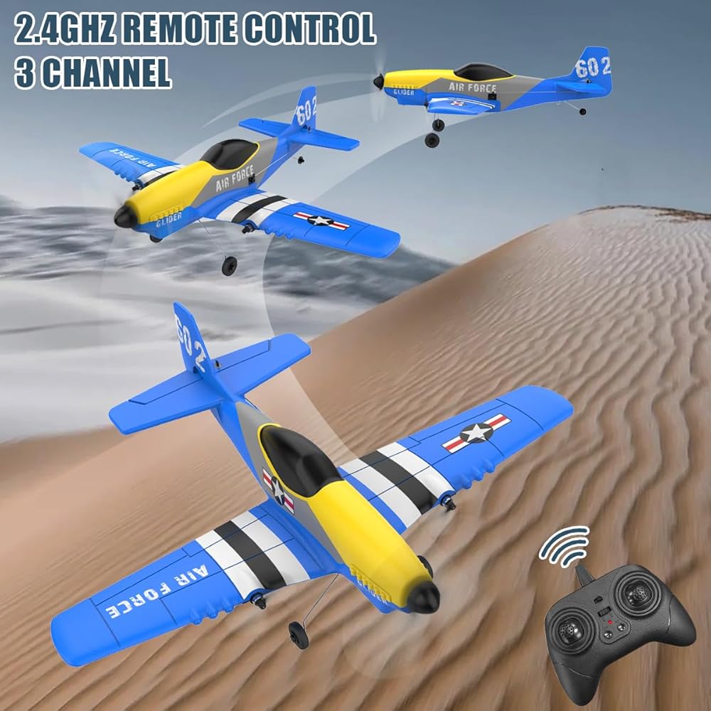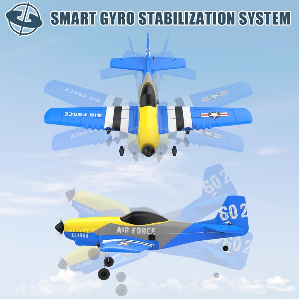 طائرة موستوب RC، لعبة مقاتلة بالتحكم عن بعد 3 قنوات، جاهزة للطيران، طائرة شراعية RC سهلة الطيران للأطفال والمبتدئين، مثبت جيروسكوبي 2.4 جيجا هرتز 6 محاور، طائرة طائرات RTF RC مع بطاريتين قابلتين لإعادة الشحن