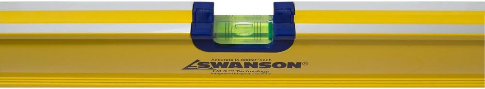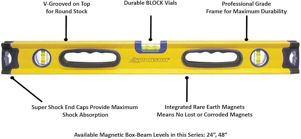 The Swanson I-Box 48-Inch Magnetic Level features rubberized end caps protect against shock when dropped or bumped. An advanced structural aluminum frame provides this level with maximum durability. It includes an impact-resistant solid block vial and comfort grips for ease of handling. This yellow level comes with Swanson's 1-year limited warranty.