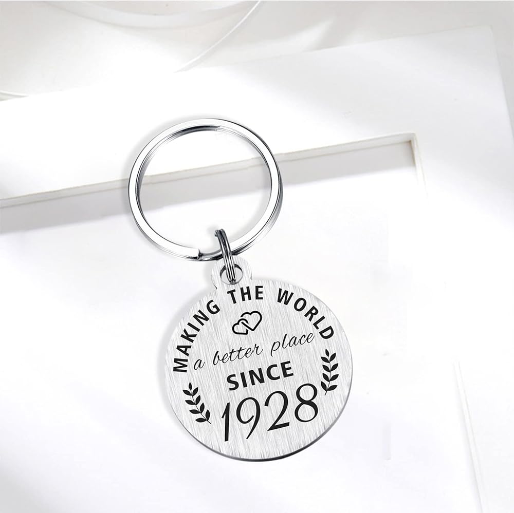 96 Year Old Birthday Keychain, Double sides laser engraved, Front side engraved "Making the world a better place since 1928". Back side engraved "Happy 96th Birthday, Behind you, all your memories. Before you. all your dreams. Around you, all who love you. Within you, all you need"