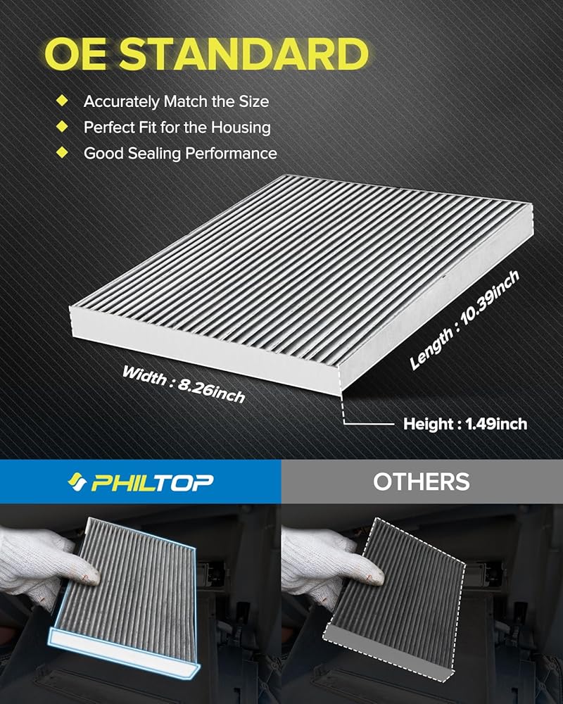 يزيل الرائحة: يستخدم فلتر كابينة PHILTOP الكربون المنشط بقشرة جوز الهند الممتازة لامتصاص الغازات الضارة والروائح الكريهة بشكل فعال، وتوفير هواء نسيم منعش للسائق والركاب.