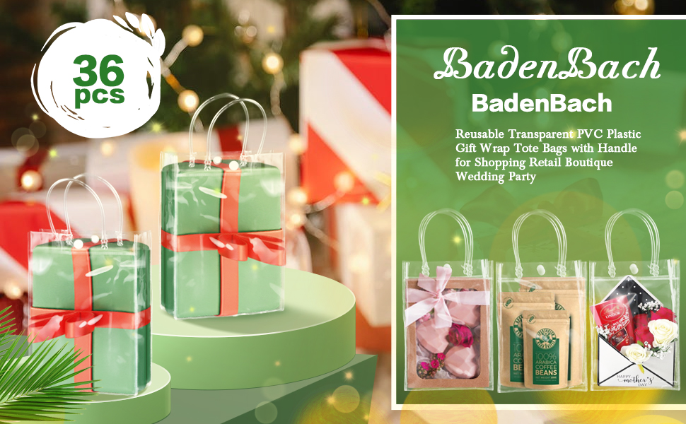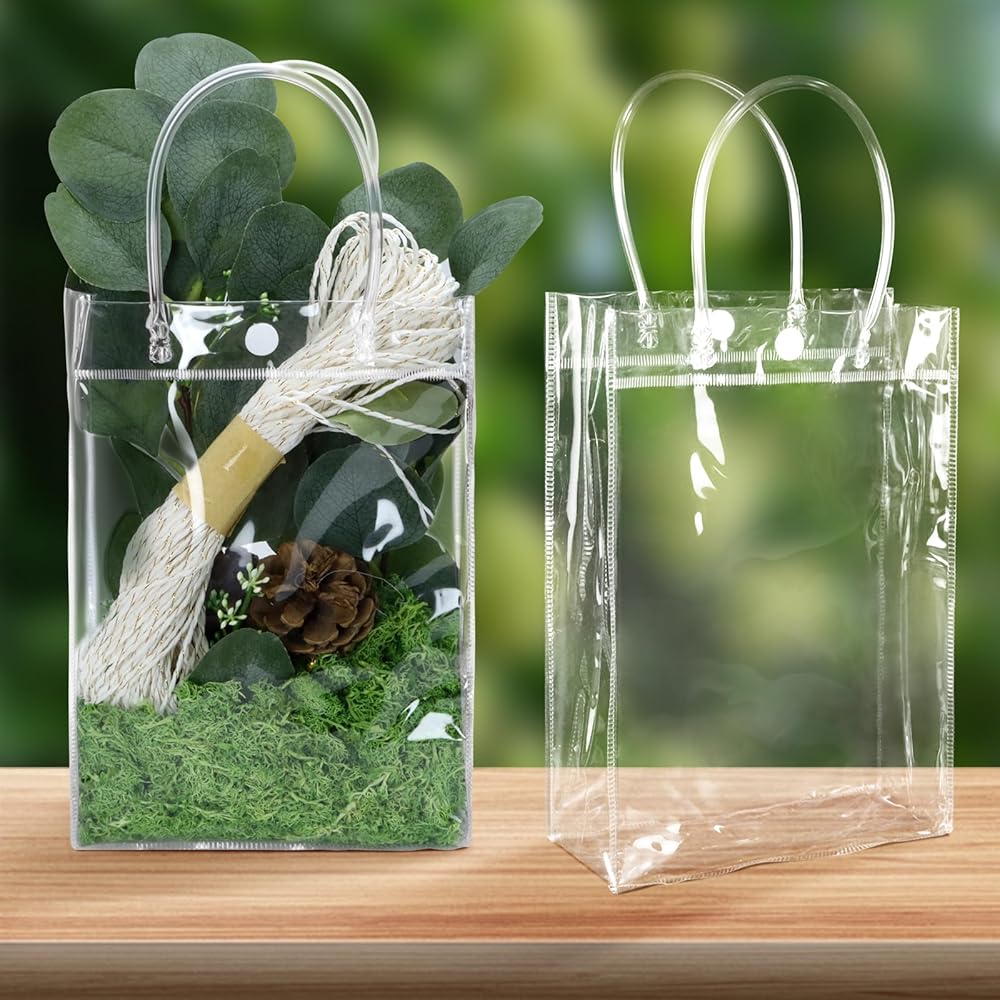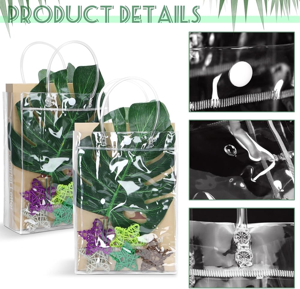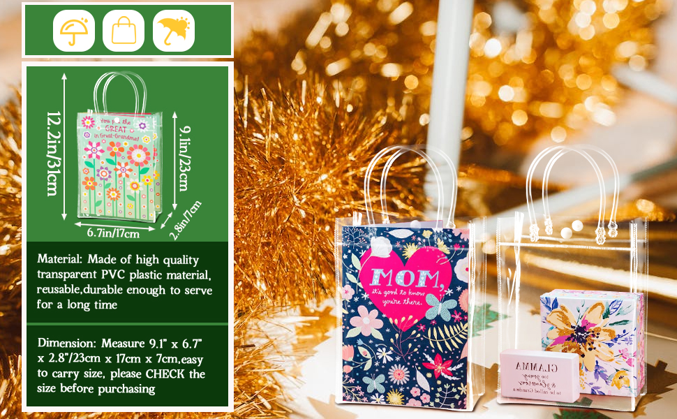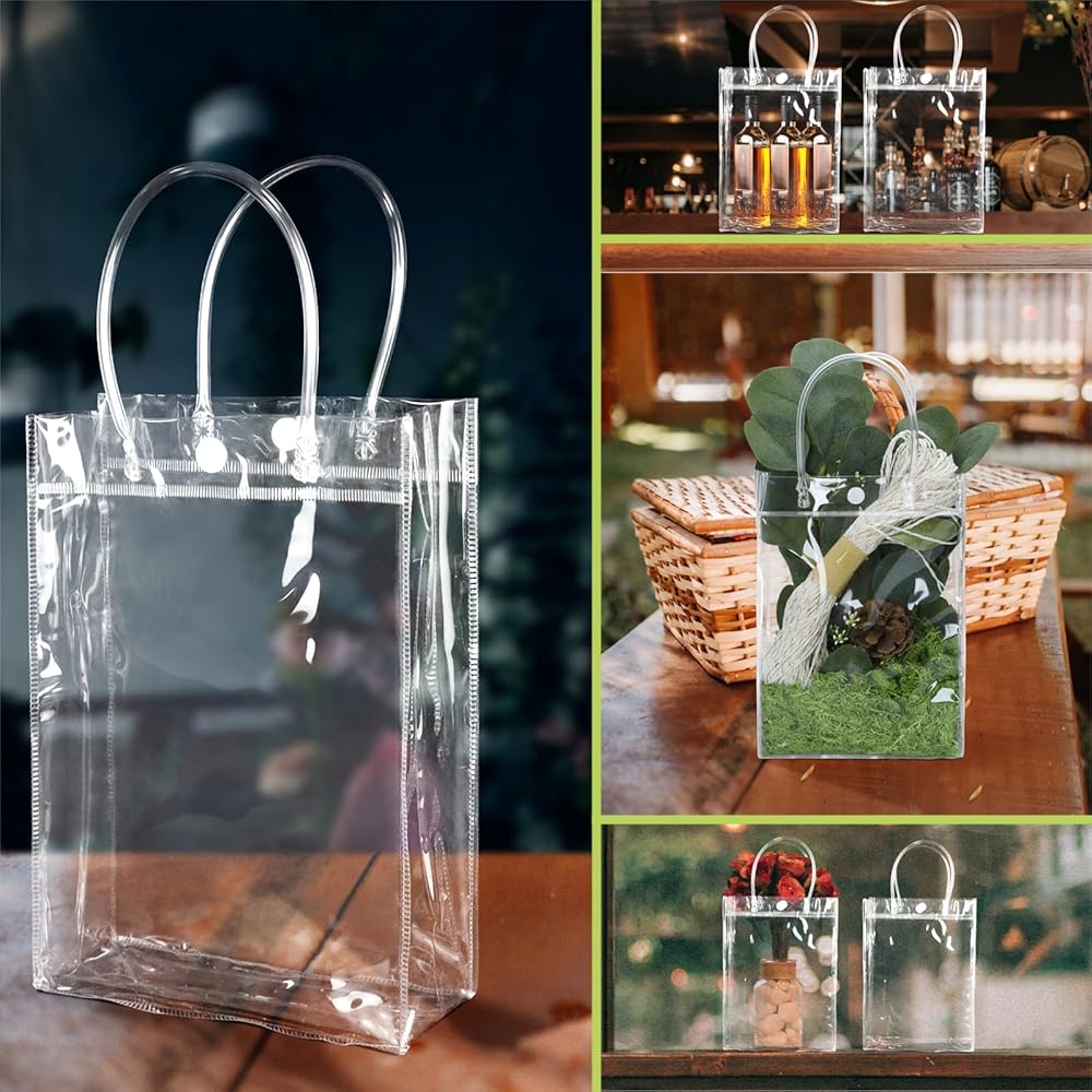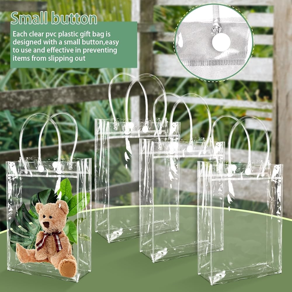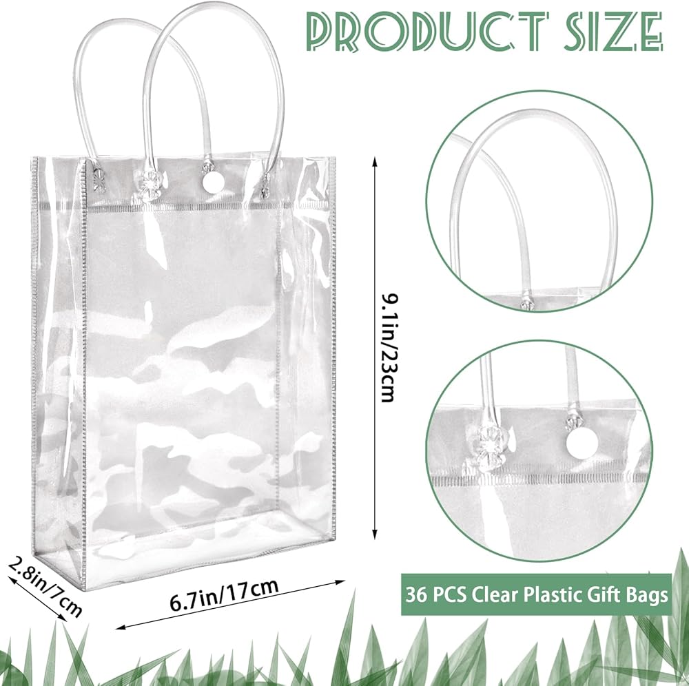 المواد: حقائب هدايا شفافة بمقابض مصنوعة من مادة بلاستيكية بولي كلوريد الفينيل الشفافة عالية الجودة، قابلة لإعادة الاستخدام، ومتينة بما يكفي لتخدم لفترة طويلة.