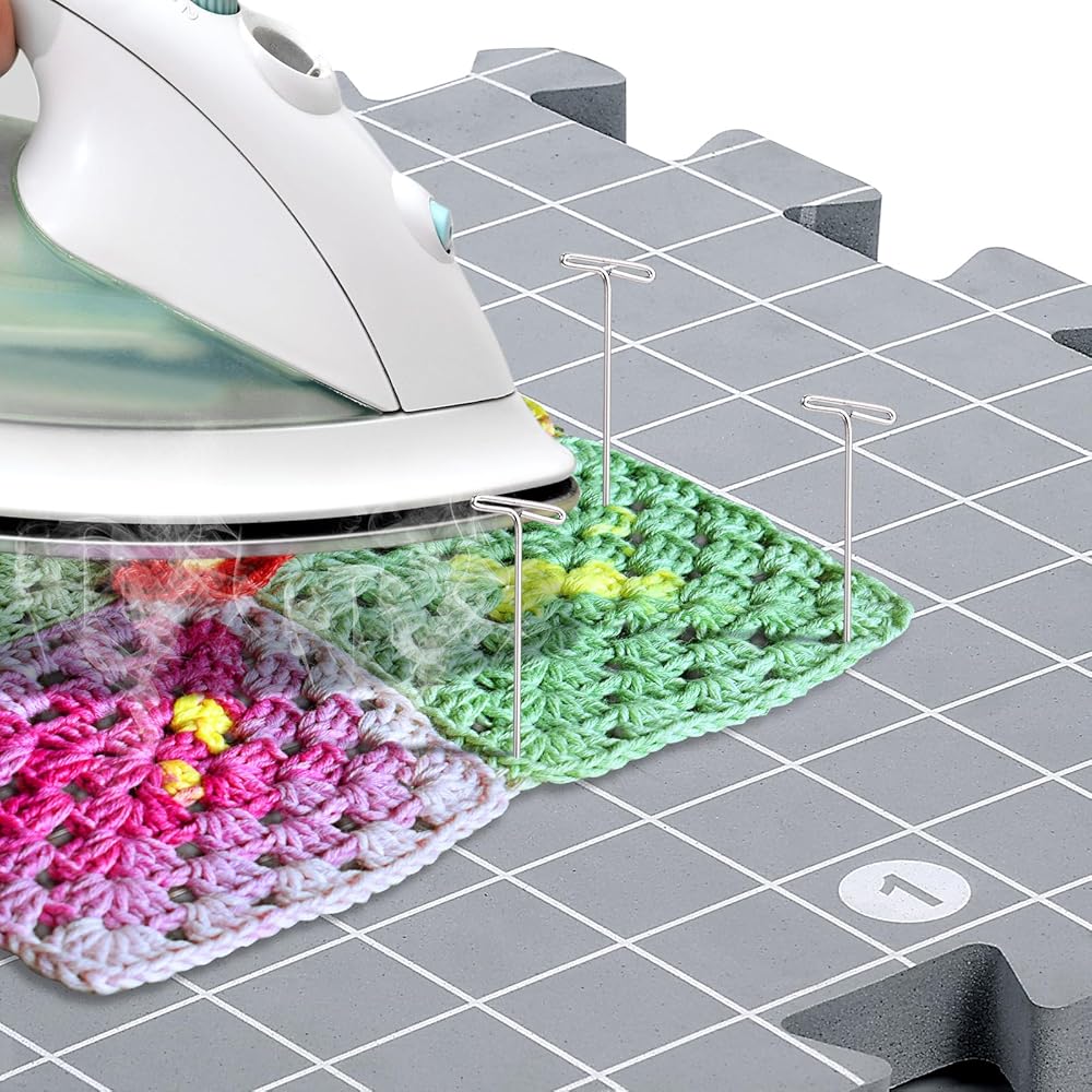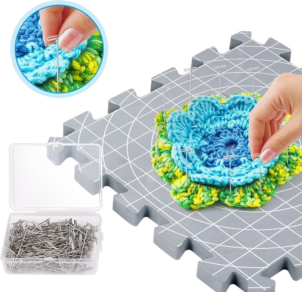 مقاومة للحرارة والبخار --- لوحة حجب الكروشيه مصنوعة من مادة مقاومة للحرارة حتى تتمكن من تبخير إبداعات الكروشيه الخاصة بك بأمان. فقط امسحي السطح ليجف ويمكنك الاستمرار في استخدامه. تضمن حصيرة الحياكة السميكة عدم خدش الطاولة عند سد الخيوط باستخدام دبابيس على شكل حرف T.