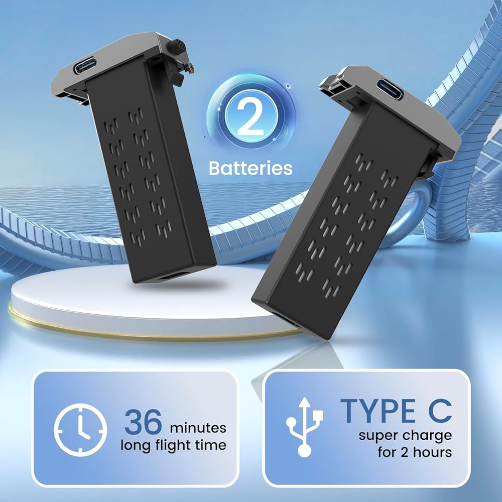 【وقت طيران أطول】استمتع بوقت طيران ممتد مع بطاريتين قابلتين لإعادة الشحن، مما يوفر ما يصل إلى 36 دقيقة من وقت الطيران الممتع. يأتي مع كابل شحن USB، مما يتيح لك شحنه دون عناء. ستصدر الطائرة بدون طيار تذكيرًا عندما تكون البطارية منخفضة، لذلك لم يعد هناك ما يدعو للقلق بشأن فقدان الطائرة بدون طيار. يوفر محركنا بدون فرش سرعة أعلى وكفاءة أعلى واستقرارًا أفضل لمقاومة الرياح، دون قلق في ظروف الطيران الصعبة.