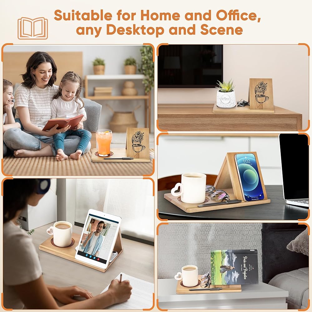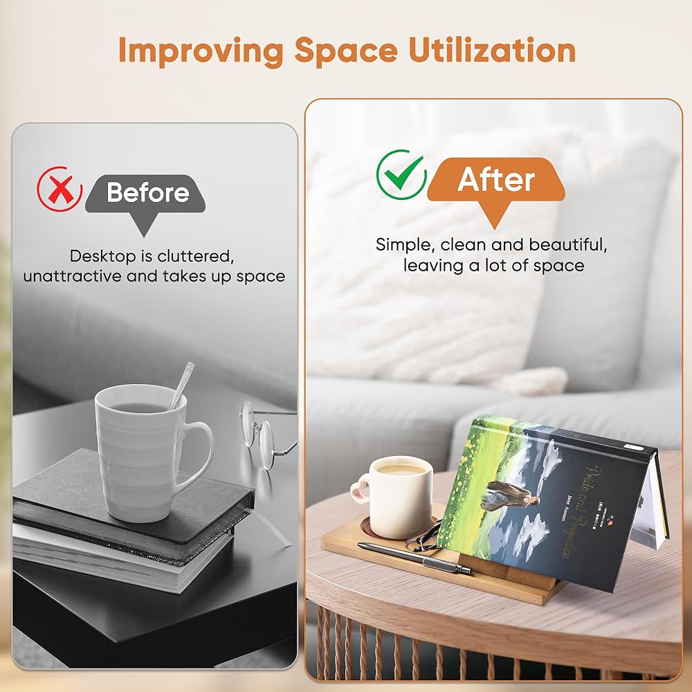 ☕ حامل أكواب ومنظم بسيط: تم تصميم عمق فتحة الكوب في حامل الكتب للقراءة بشكل أعمق باستخدام قواعد أكواب مقاومة للماء وعازلة للحرارة بنفس اللون، حتى تتمكن من وضع القهوة والعصير والحليب والمشروبات الأخرى. بالإضافة إلى ذلك، تتوفر مساحات أخرى للأقلام والهواتف المحمولة والنظارات وما إلى ذلك، مما يجعل مساحة دراستك أكثر أناقة وجمالاً.