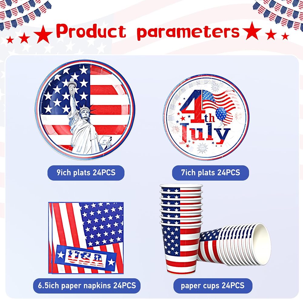 • Patriotic Party Supplies Decorations: The American themed party decorations is great for patriotic party tableware set, red white and blue decorations. Including 24pcs 9 inch plates, 24pcs 7 inch plates, 24pcs napkins, 24pcs cups, enough for serving 24 guests.