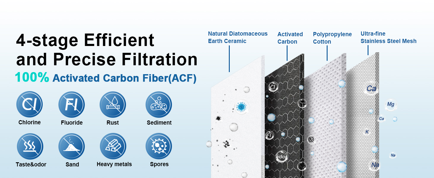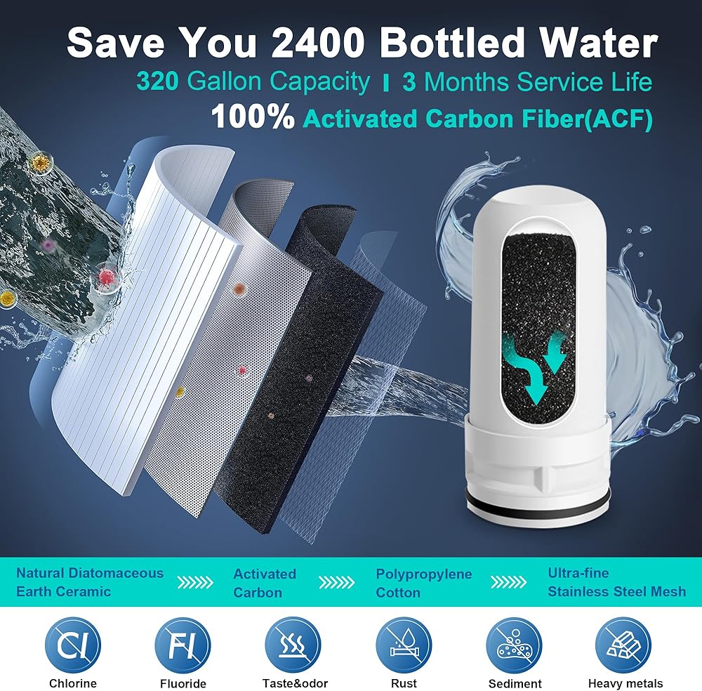 مذاق مياه فائق - رشفة من الكمال: استمتع بفخامة شرب الماء الذي تم تحويله، مع ما يصل إلى 94.5% من الكلور الذي تم القضاء عليه بخبرة، مما يقلل من الرصاص والرواسب والصدأ والفلورايد. لا يقوم الفلتر المتطور الخاص بنا بتنقية المياه فحسب، بل يعززها أيضًا من خلال إعادة إدخال المعادن الأساسية. إنها دعوة للانغماس في الماء النقي جدًا، كل كوب هو بمثابة نخب لصحتك ورفاهيتك.
