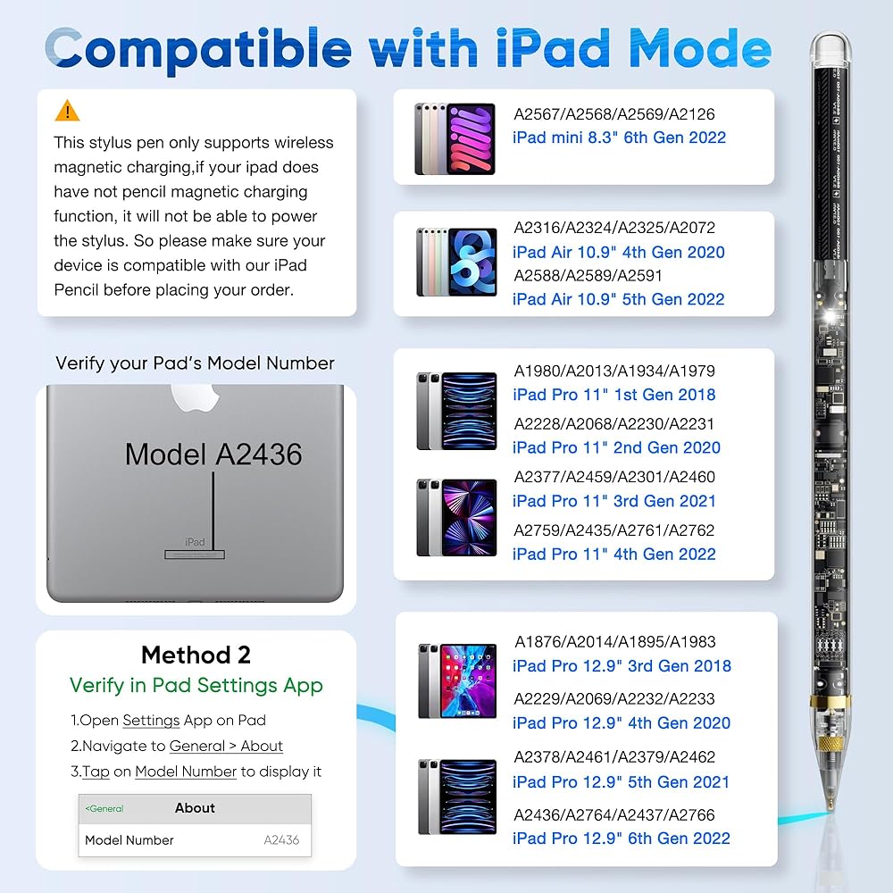 【موديلات iPad المتوافقة: وظيفة الشحن اللاسلكي لقلم iPad تدعم فقط iPad مع وظيفة الشحن اللاسلكي بالامتصاص المغناطيسي. يرجى التأكد مما إذا كان جهاز iPad الخاص بك يدعم الشحن المغناطيسي قبل الشراء. يدعم الجيل الثاني من iPad Pencil الجيل الثاني لجهاز iPad Pro 11 بوصة الأول/الثاني/الثالث/الرابع (2018) -2022)، iPad Pro 12.9 بوصة 3rd/4th/5th/6th (2018-2022)، iPad Air 4th/5th وiPad Mini 6th. لا يعمل مع iPhone أو Android Phone أو Android Tablet أو أجهزة Microsoft.