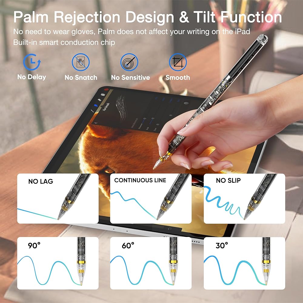 【وظيفة رفض راحة اليد والإمالة】يعتمد قلم iPad المطور تقنية رفض راحة اليد، مما يسمح لك بوضع يدك بشكل مريح على شاشة iPad دون ارتداء القفازات، والكتابة والرسم بشكل طبيعي مثل الورق. وظيفة الإمالة والسمك، يمكنك رسم ضربات بسُمك وعمق مختلفين عن طريق تغيير إمالة رأس القلم، مما يجعله مثاليًا للرسم أو الكتابة أو الرسم على جهاز iPad.