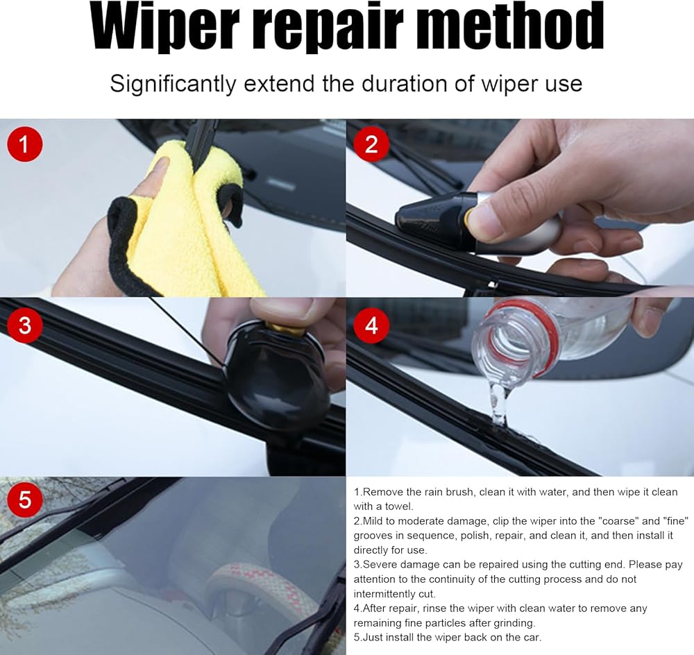 Precise Repair: Car wiper repair device has grooves that fit the wiper design for more accurate cutting of damaged parts of scratched wipers. Two-way sandpaper for finer sanding. Two processes, one coarse and one fine, for different wear and tear repair. Thick side is suitable for removing dirt, oil and debris from wipers. The thin side is used to repair aging wipers.