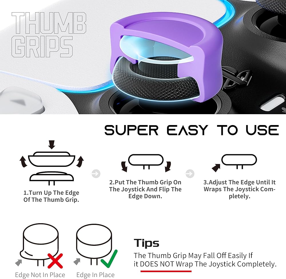 • 【Easy to install】Just take a few steps to install the thumbstick caps on the controller.Step 1Turn up the edge of the grip.Step 2.Press down the grip on the thumbstick.Step 3.Adjust the edge of the grip while rotating the thumbstick covers onto the joystick until it is fully covered completely.