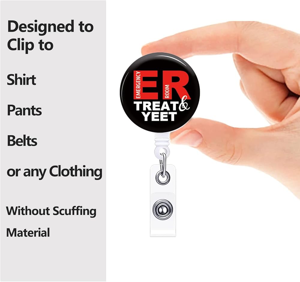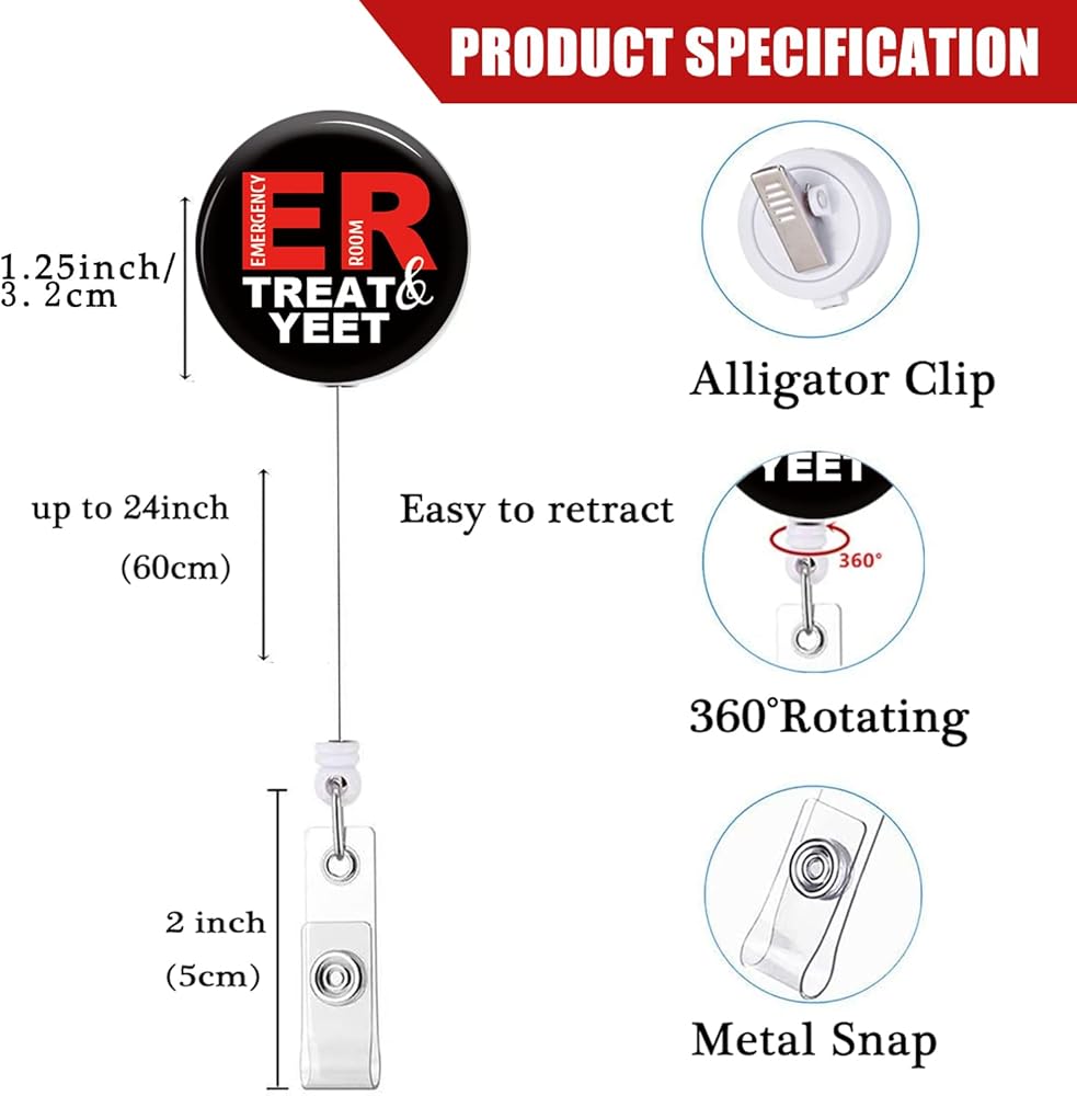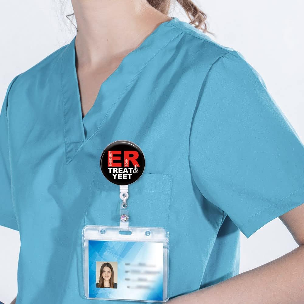 شارة بكرة قابلة للسحب مع مشبك التمساح "Treat and Yeet" حامل شارة مضحك لغرفة الطوارئ ER ممرضة مكتب طبي اسم معرف الديكور