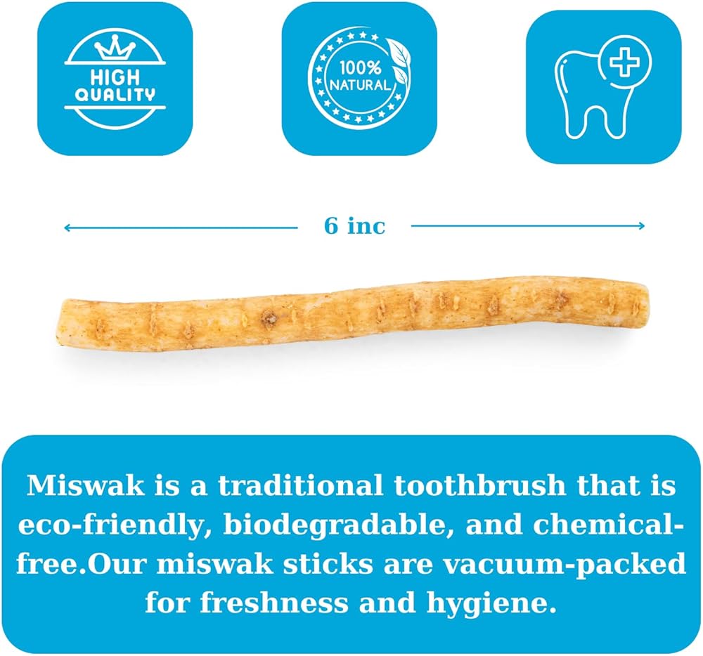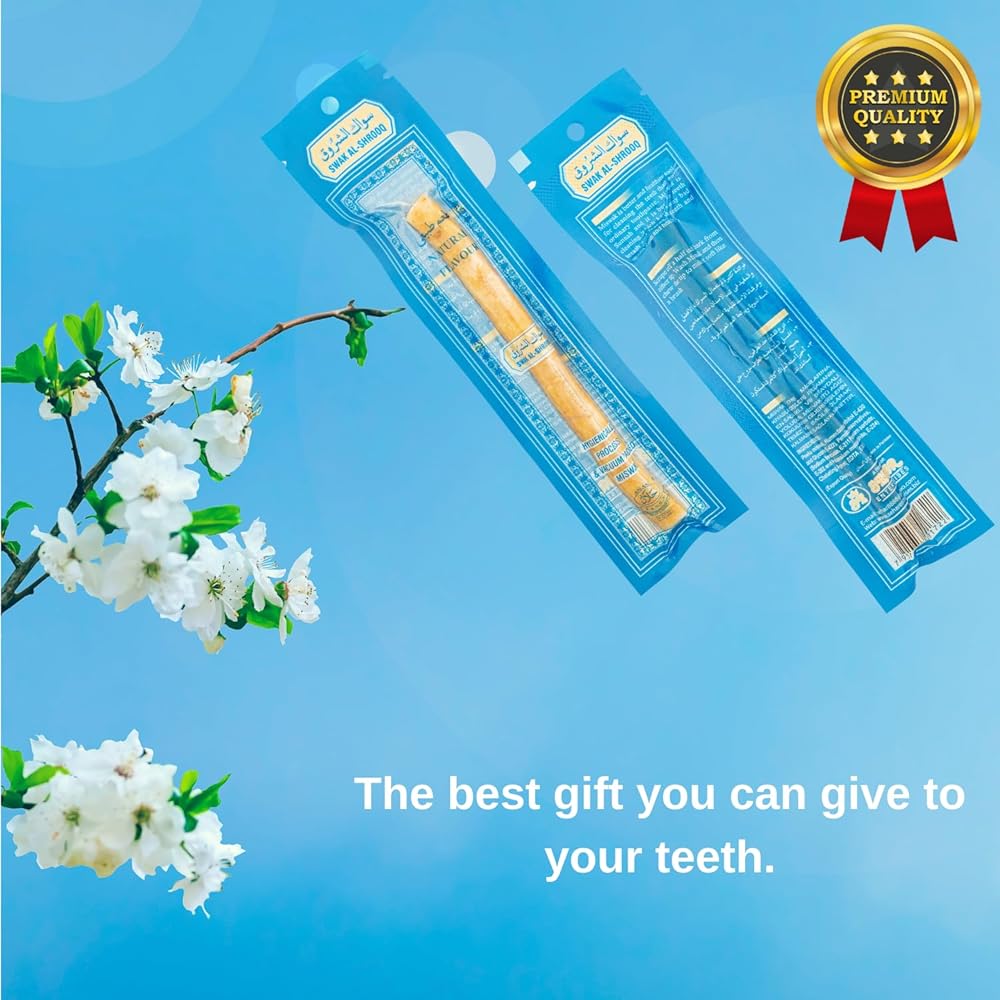 🦷 العناية الفعالة بالفم: استمتع بقوة فرشاة الأسنان الطبيعية، حيث أن أعواد المسواك معروفة بخصائصها في مكافحة البلاك وتبييض الأسنان وخصائصها المنعشة للنفس.