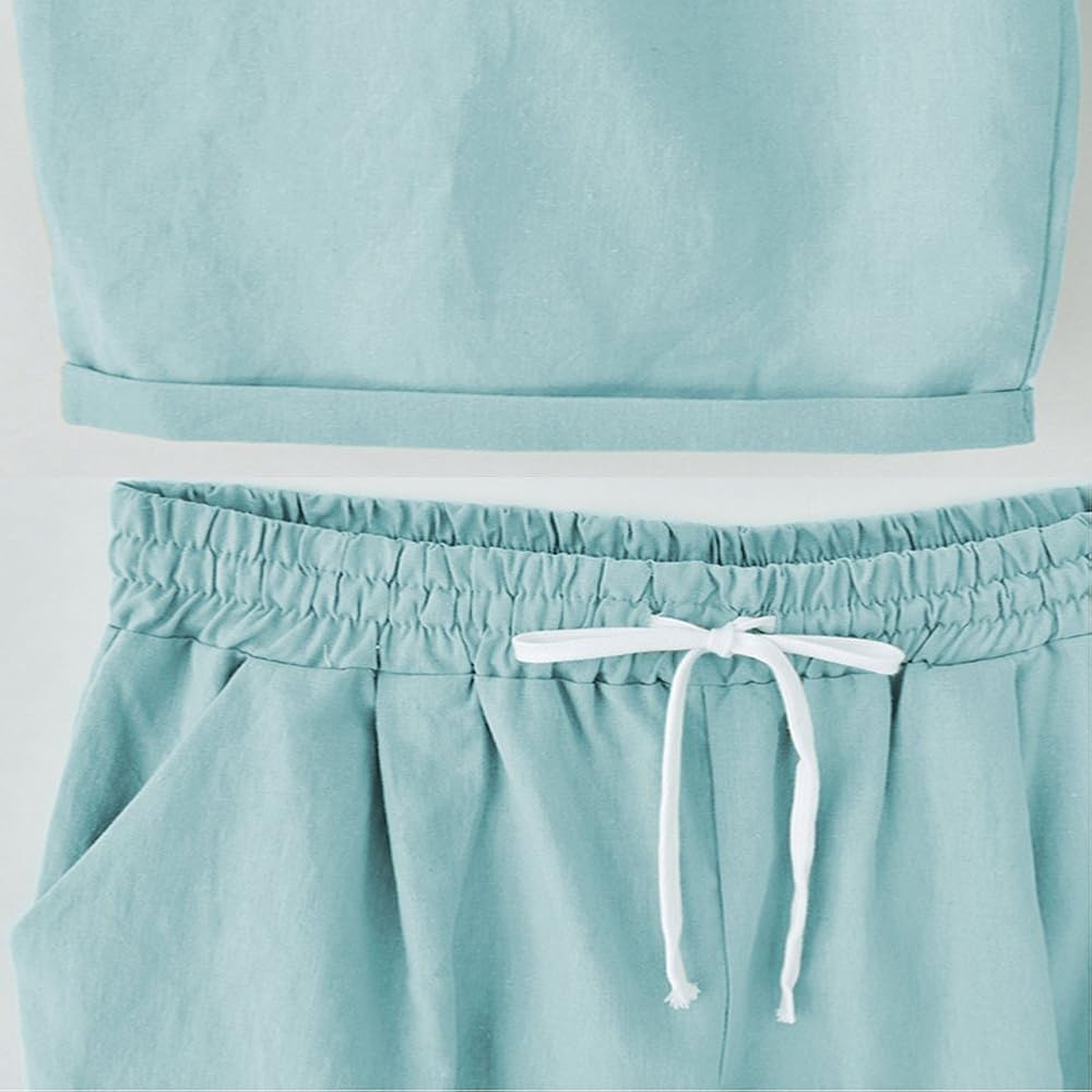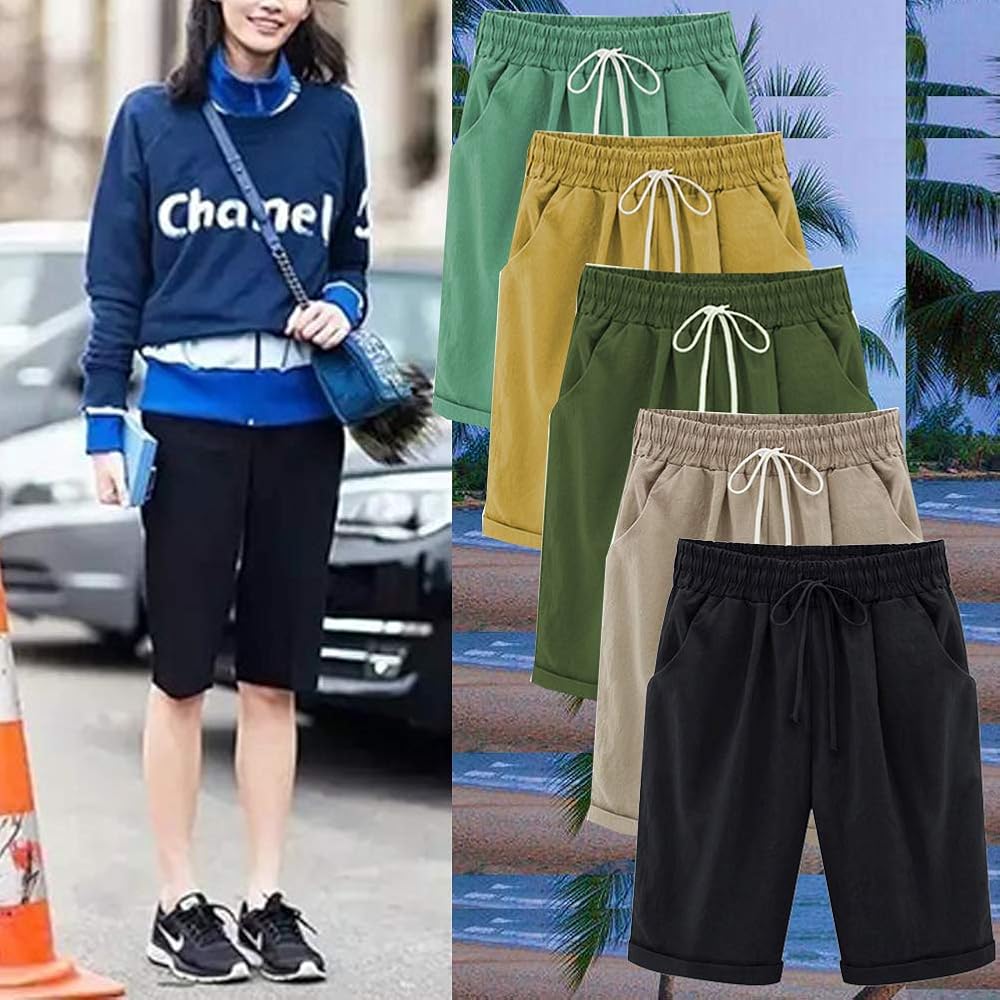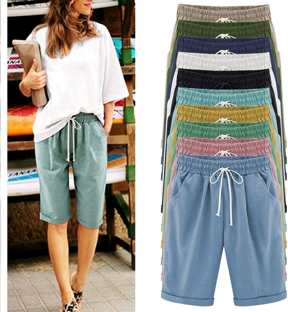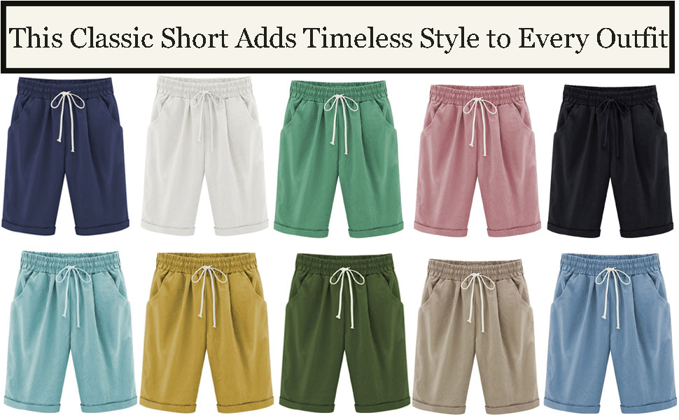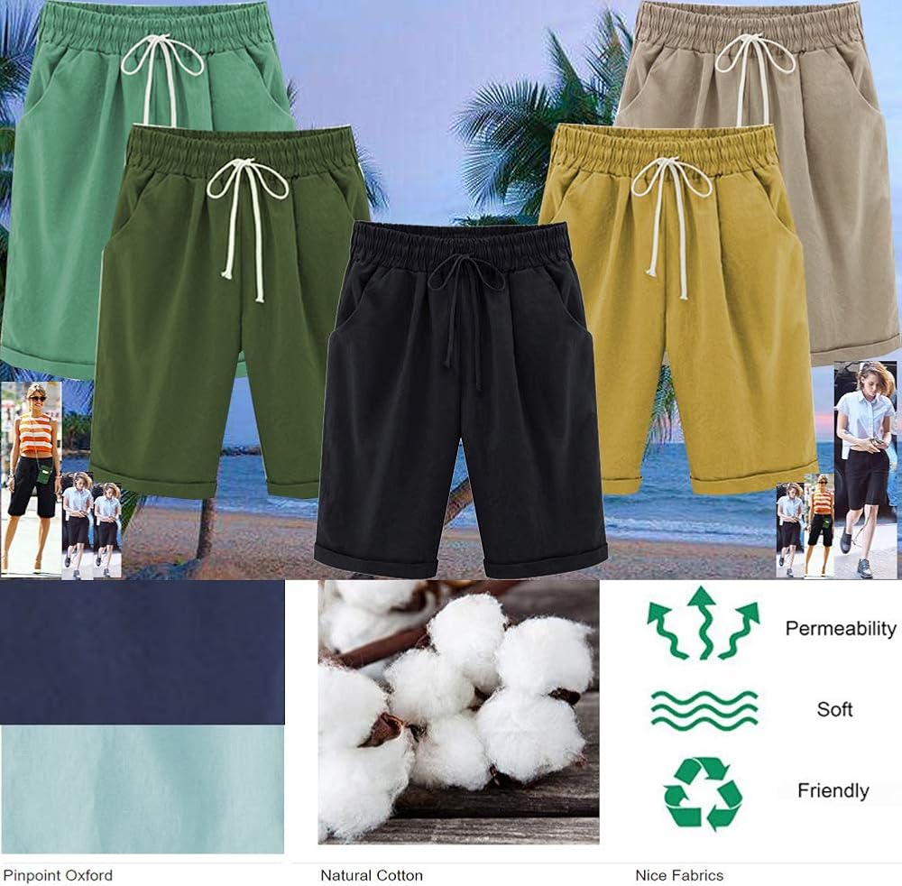 • شورت برمودا نسائي كاجوال للخروج من القطن بخصر مطاطي بطول الركبة مع شورت صيفي برباط مع جيوب، تجعيد بطول الركبة مطابق تمامًا. مناسب لأي يوم دافئ