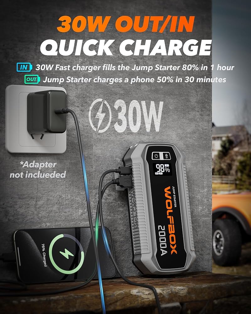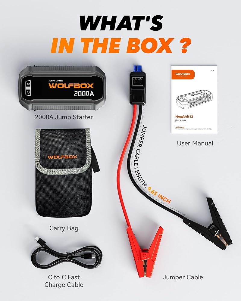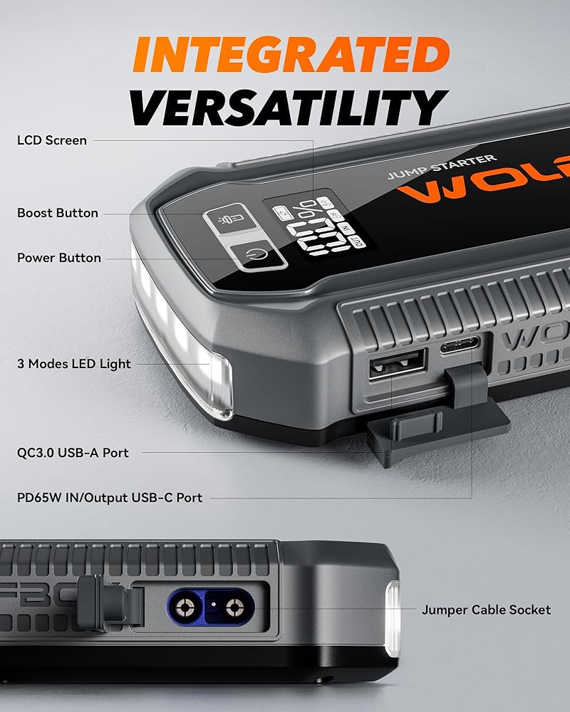 جهاز تشغيل القفز عالي السعة 3000 أمبير - جهاز تشغيل بطارية السيارة هذا مع بطارية قوية بقوة 16000 مللي أمبير في الساعة، وهو مثالي للمركبات 12 فولت، بما في ذلك السيارات والشاحنات والقوارب والمركبات الأكبر حجمًا. يمكنه إحياء البطاريات الميتة بسرعة في حالات الطوارئ، سواء كان لديك سيارة تعمل بالبنزين أقل من 8 لتر أو سيارة تعمل بالديزل في المنزل.