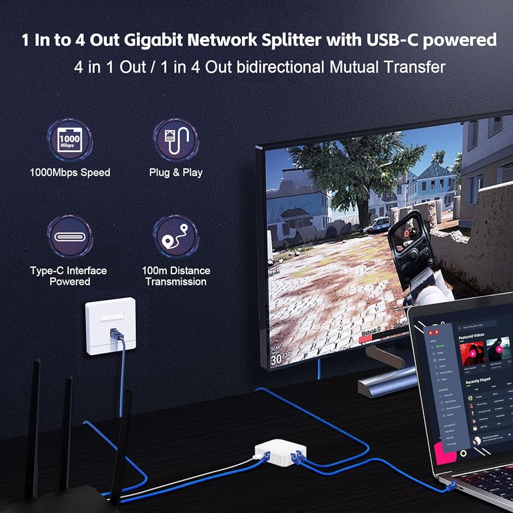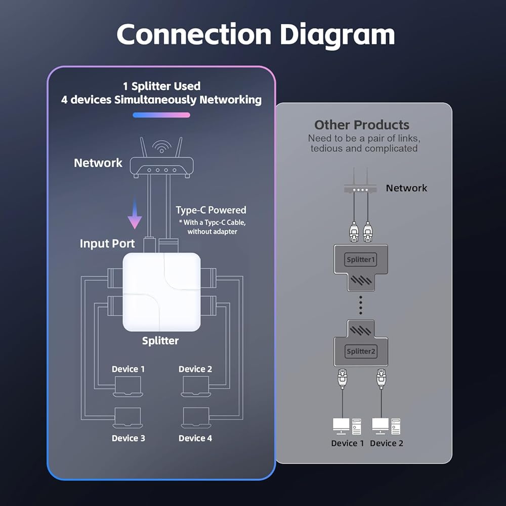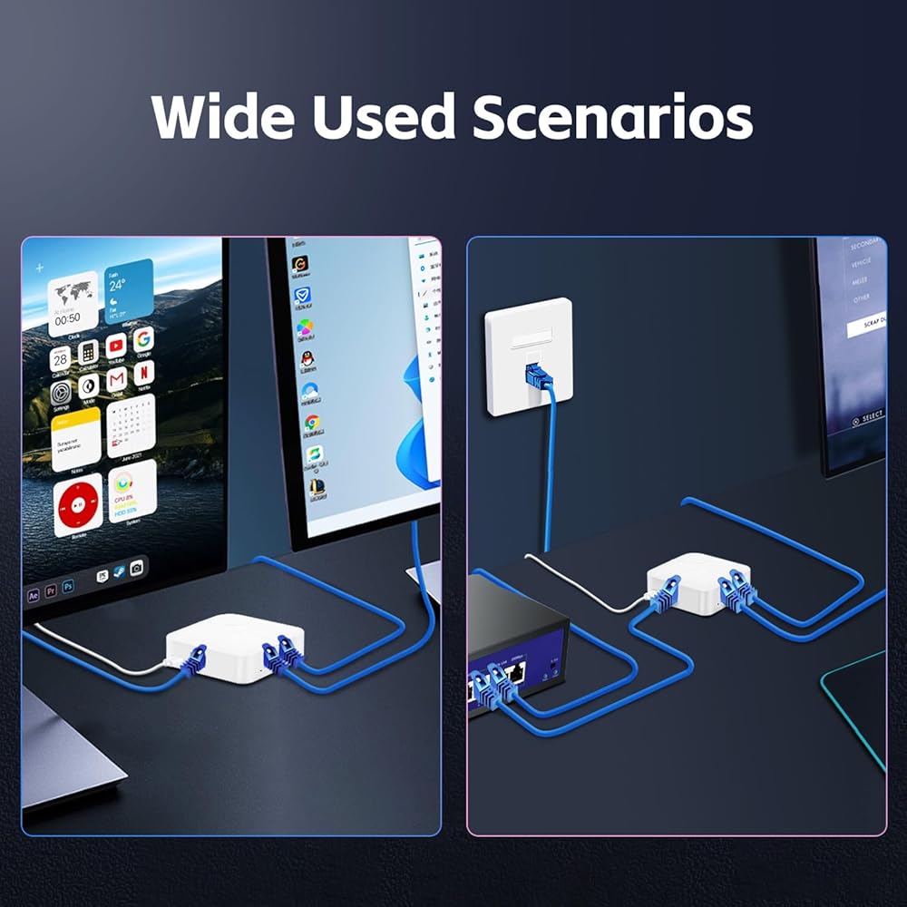 Simultaneously Online: both 2 output ports can be used at the same time, ensuring uninterrupted internet access for both devices. With a transmission distance of up to 100 meters, it is perfect for sharing a single network.